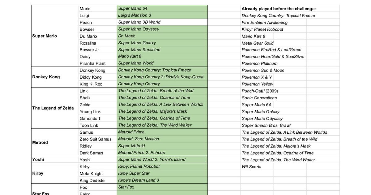 For each character I picked the game I thought was most relevant, most similar to their depiction in Smash, or provided their backstory. Sometimes I just chose a game I was most interested in, assuming it still fits. For simple characters or characters who appear in lots of games, I was pretty lenient on which one I chose. If you want, you can look at the checklist here: [https://docs.google.com/spreadsheets/d/1rOlk8dXwEL6wd2Lw4zouBiAce8UJabHOIgIP8bKL\_7c/edit?usp=sharing](https://docs.google.com/spreadsheets/d/1rOlk8dXwEL6wd2Lw4zouBiAce8UJabHOIgIP8bKL_7c/edit?usp=sharing)