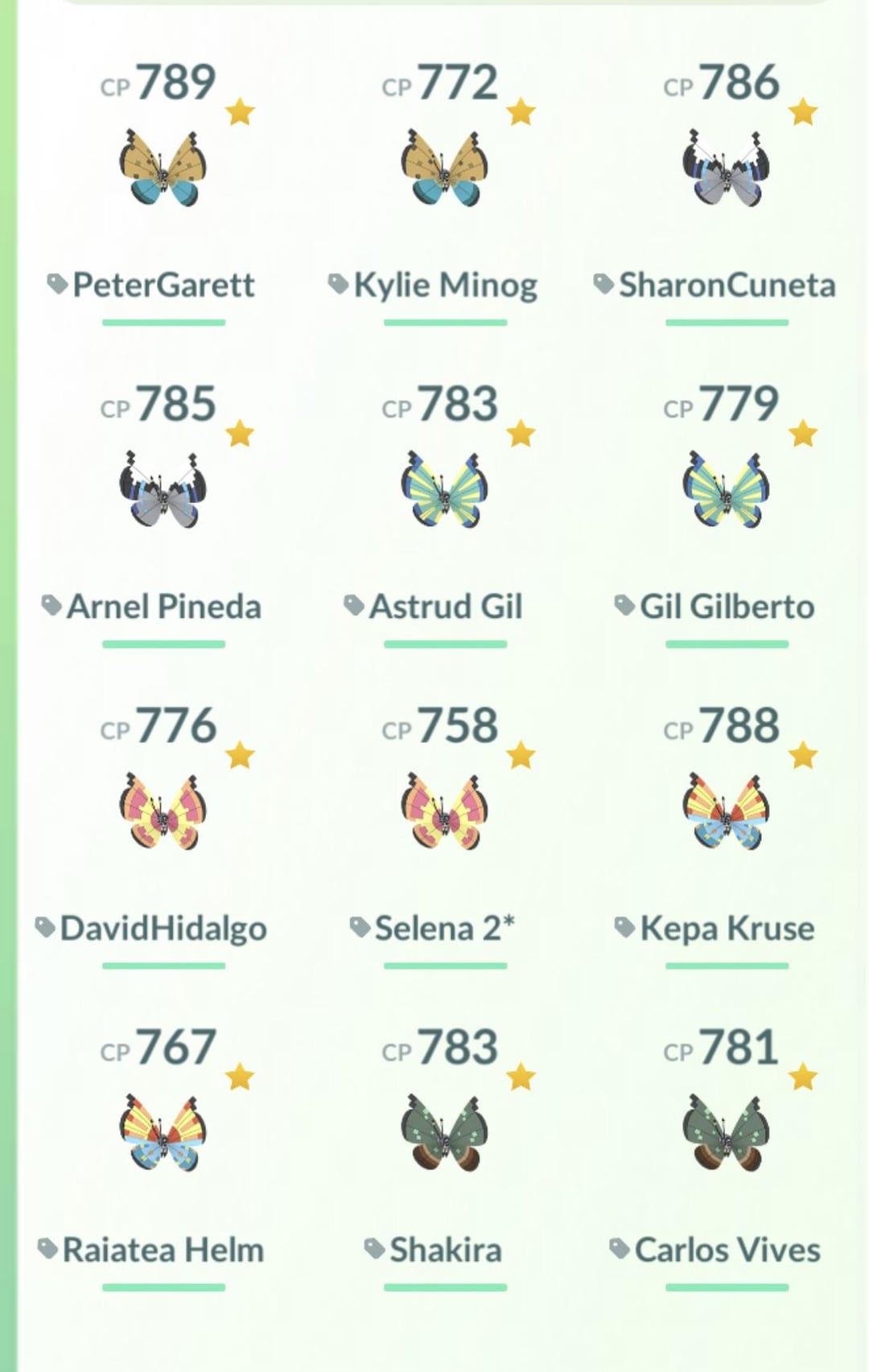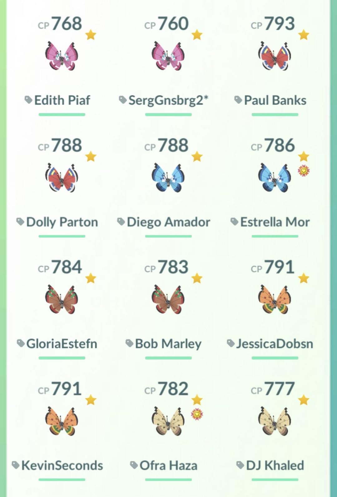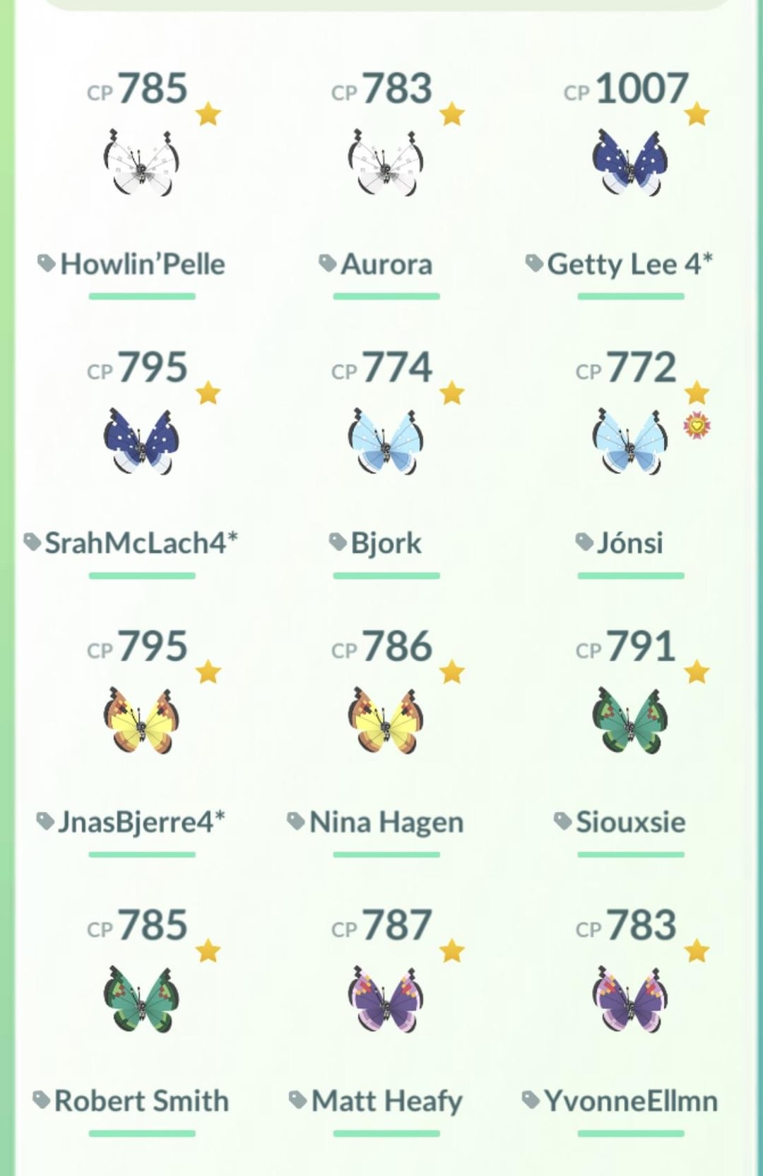 Here’s my collection of a male and female of each Vivillon (I know they look the same but 🤷🏻‍♀️). They’re all 3* except two 2* and three 4*. Thanks worldwide Friends!