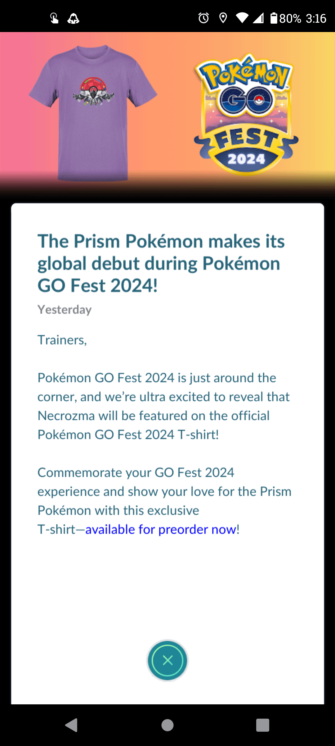 It would seam this may be the baitiest bait they have ever thrown. Notice the clever use of ultra and necrozma. Along with his big reveal on a T-shirt. It would turn out to be a most hilarious event if Necrozma turned out to not become available during gofest 2024. And his appearance was souly on a T-shirt. Surely Niantic would never do such a thing. It would make a decent marketing scheme. $15 for a T-shirt today and in 3 months pay $7.99 for a “special research” where you can have a chance at this elusive prism pokemon! Now all u naysayers I understand this isn’t what’s happening here I’m only trying to point out the fact that this is how the game has felt to me as of late. I would love to hear how you all agree or disagree.