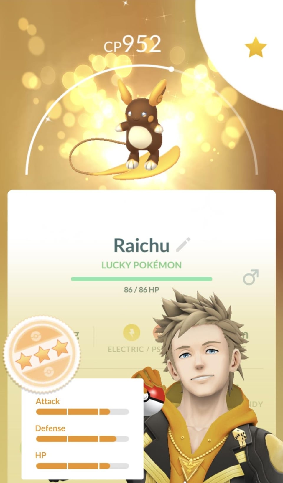 Getting a lucky shiny Alolan Raichu is so awesome!! It goes great with the background, and the shiny form is already pretty rare to get. I’d suggest Pancake because during the Sun and Moon anime, there’s a place where you can go and an Alolan Raichu will serve you pancakes. 😀