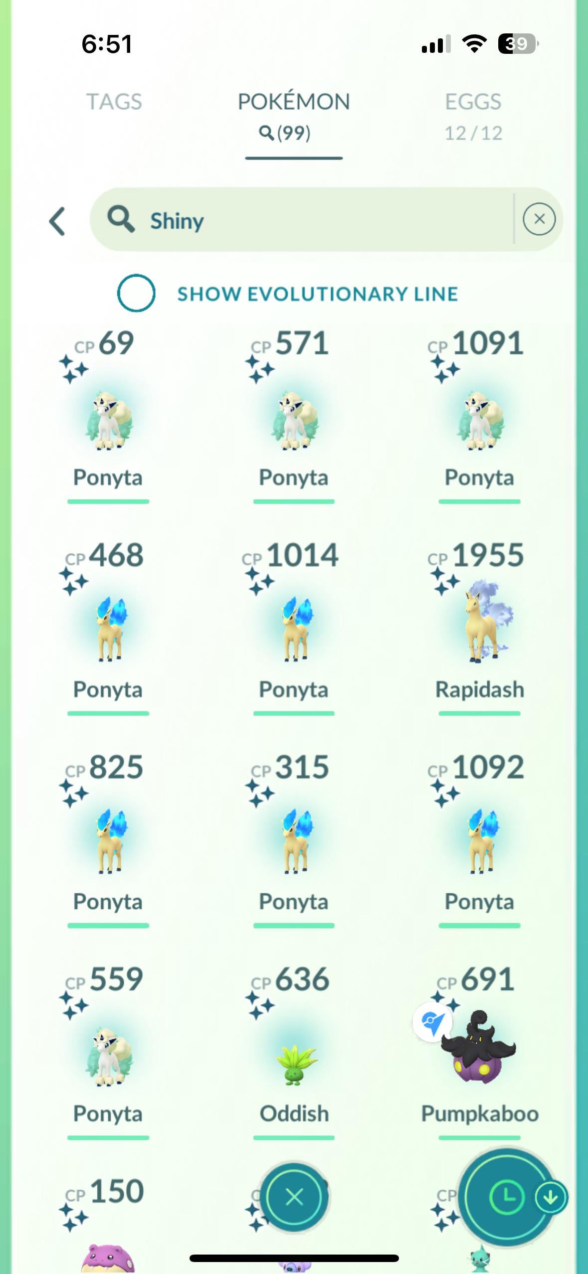 Respectable shiny haul from the Ponyta event AND an Oddish and Pumpkaboo! Oddish is one of my favorite Pokémon, and I’ve always wanted a shiny one!