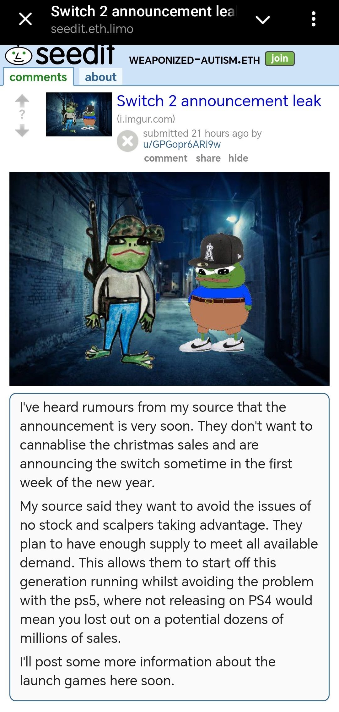 Yesterday, a poster on plebbit claims to have inside information about swtch2