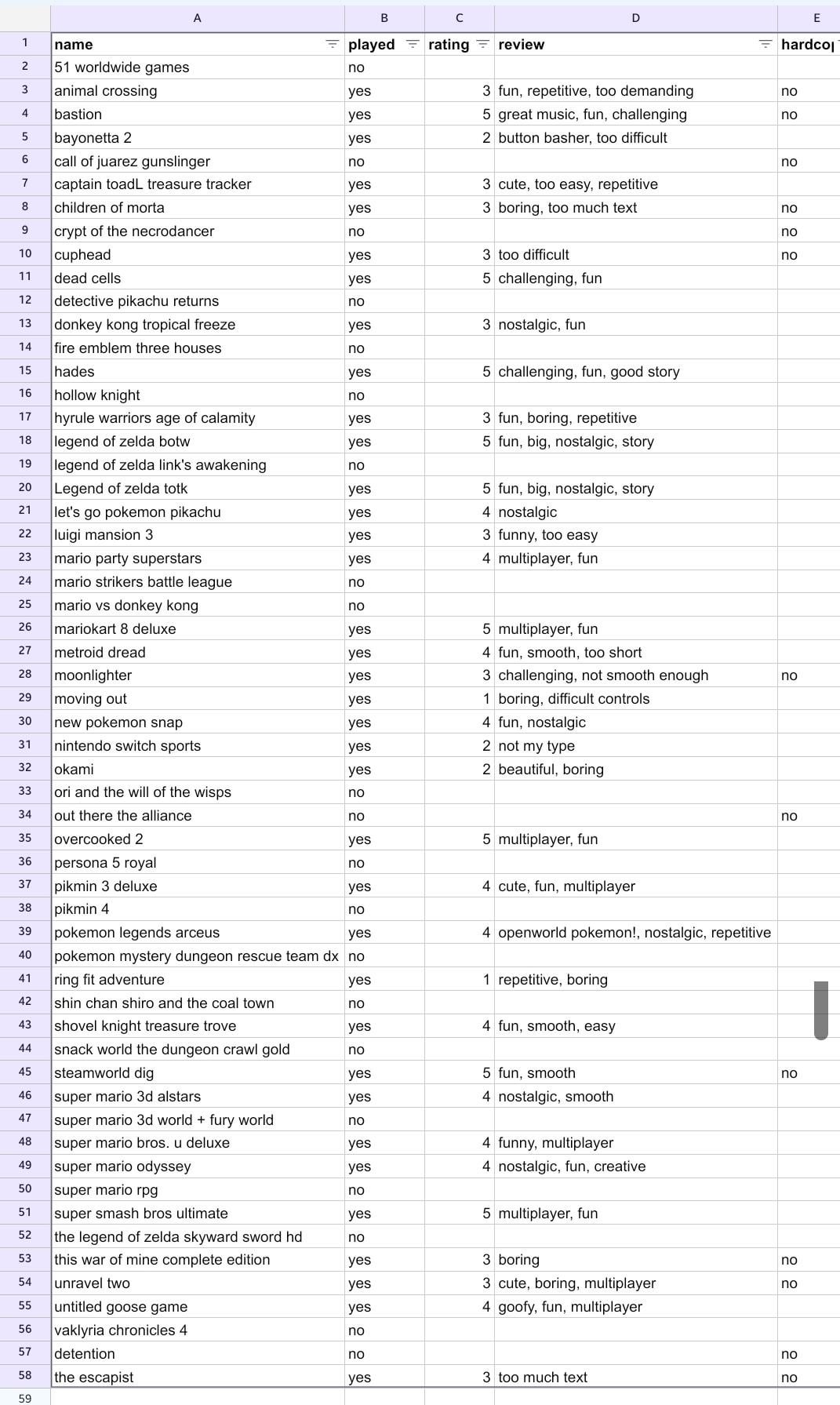 In the picture are the games I have on switch with a simplistic review system, most are as cardridge, I've only played about half of them.