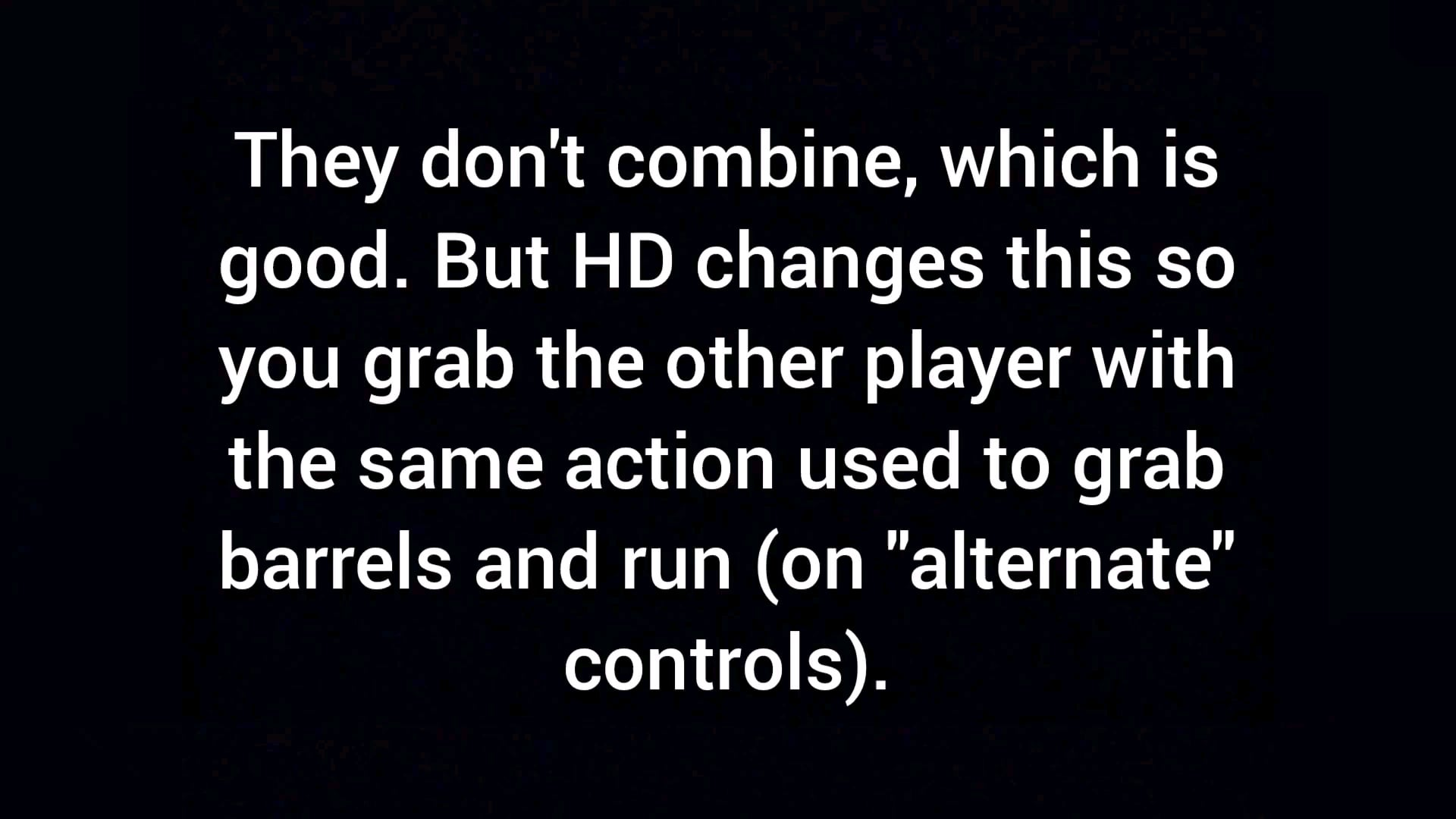 Another issue pertains to how grabbing now works, which has run (for alternative controls), grab, and combine all assigned to the same button. In the original to combine you had to simultaneously press up on the D-pad and the grab button, now it's just the grab button. This particularly screws over the Diddy player as many times the DK player will accidentally grab Diddy. This means the Diddy player may have to constantly dismount DK in order to play independently. This is not just a nuisance, but can also result in death (as shown in the video).