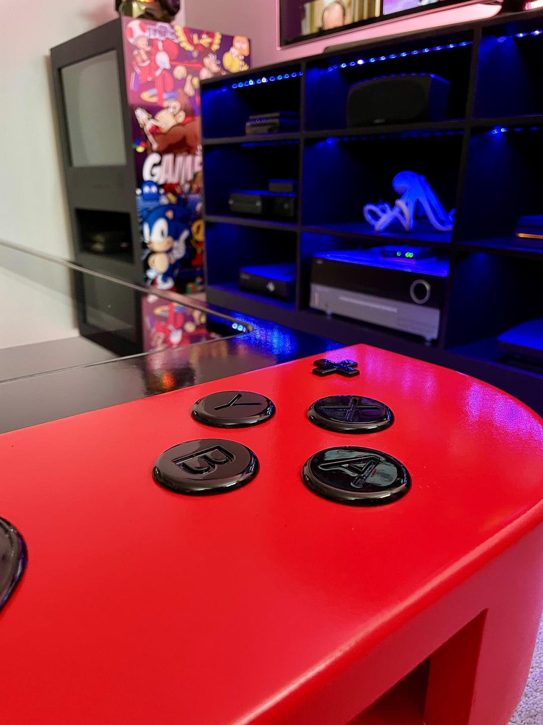 It has adaptive lighting built in underneath. It has power run to it under the floor and through one of the legs. The buttons are 3D printed and purely decorative. The small shelving doubles as analogue amplifiers for the speakers within. It took 3 days to build and over a month to paint. Then 3 coats of primer with sanding in between. Then 3 coats of color with wet sanding in between, and 3 coats of clear with β you guessed it, sanding in between each coat as well. Then it was buffed for hours with pure carnuba wax to give it just a bit extra. Just waiting on some tinted glass to put over it so I can use it as a table without worrying about scratches. The glass will fit in the middle and line up with the colored sections in terms of height.
