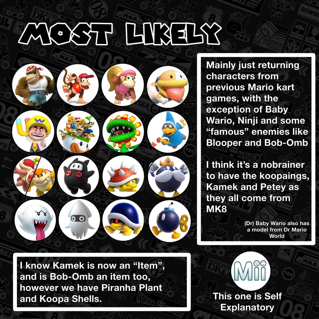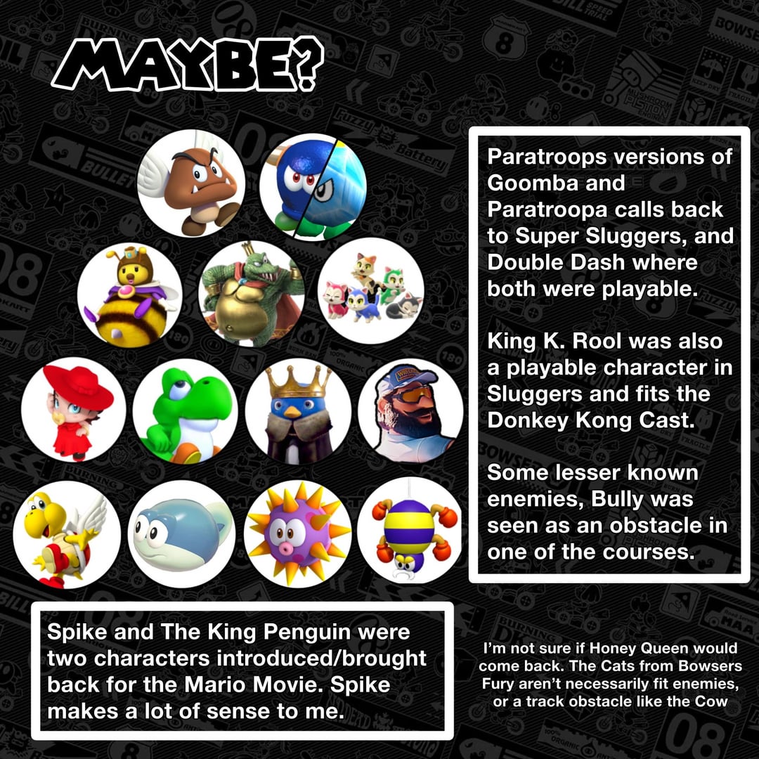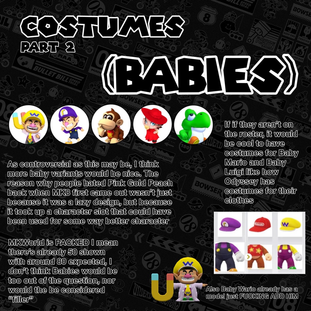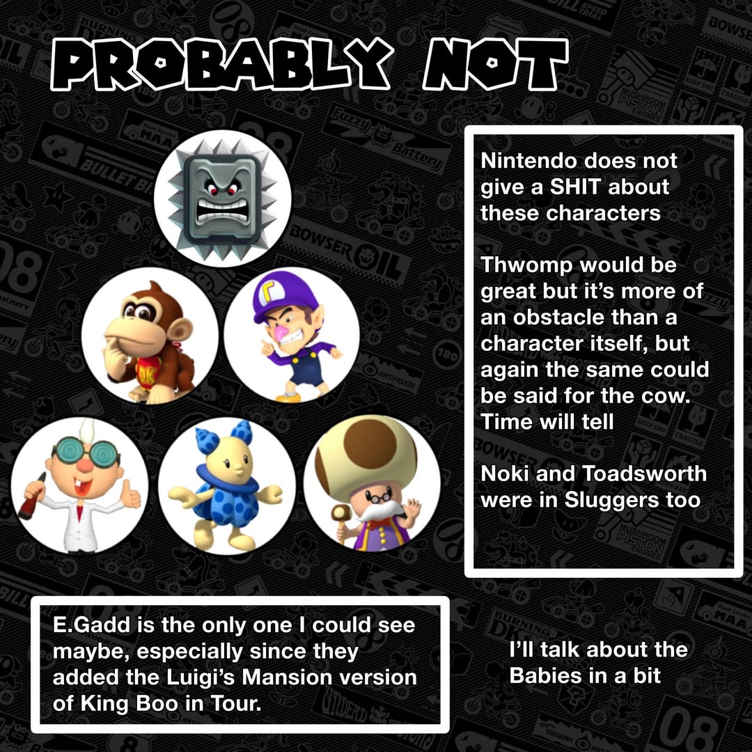 The one thing I didn’t put in here that people disagreed with was Baby Wario. Double Dash introduced Baby Mario and Luigi, Wii introduced Baby Peach, Daisy, and 8 introduced Baby Rosalina. If they were going to add another baby, it would probably be Wario as 1.) he was part of Yoshi DS, and 2.) has a model (for his head atleast) because of Dr Mario World. Either Baby DK, DK jr. could also be reintroduced, but I don’t see that being likely. Nintendo absolutely hates Waluigi so I would be shocked if he was a character. In the end, I’m okay with them both just being costumes like I said in Part 2.