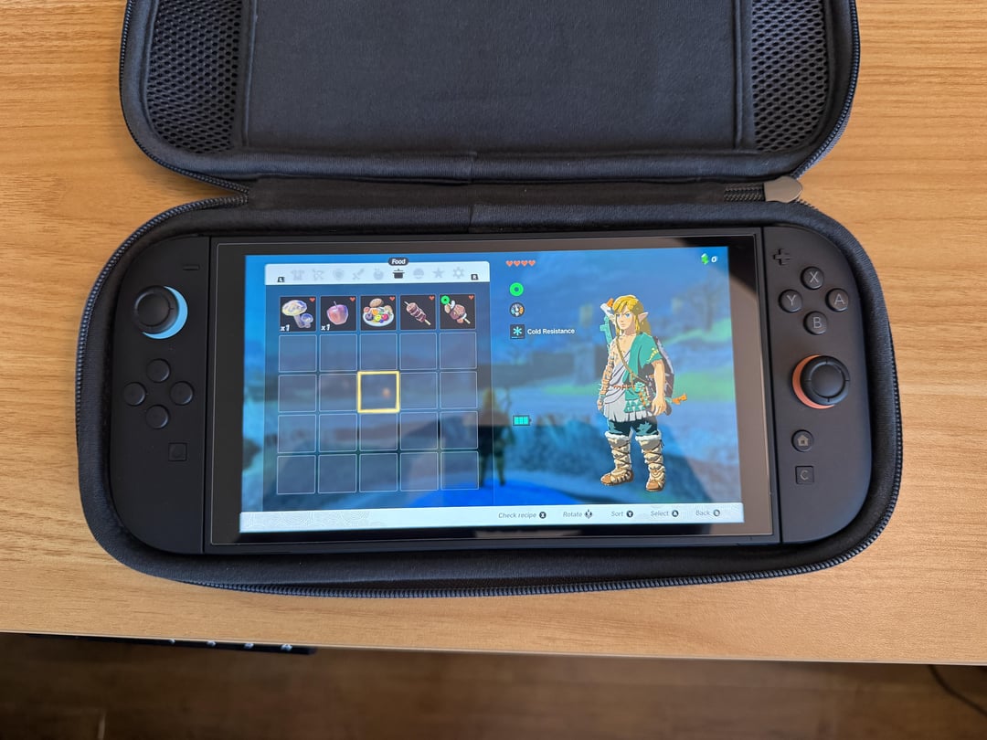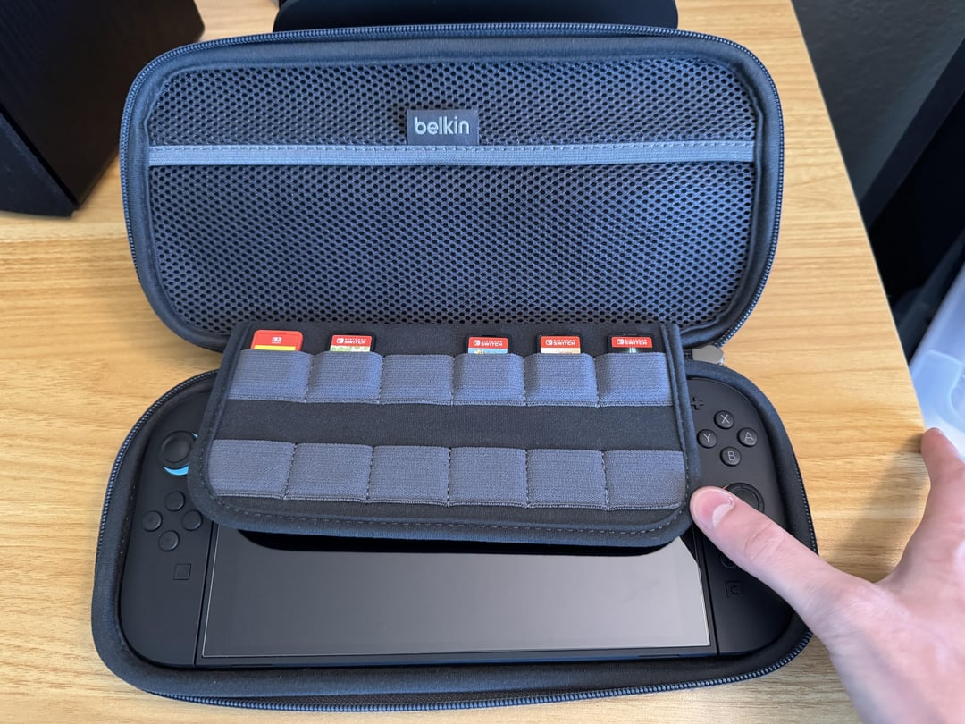 On the inside there's a mesh pouch and a space for 12 cartridges. I've been able to fit some joy-con straps in the pouch, but I personally wouldn't put anything too bulky in there for the sake of applying too much pressure to the Switch. For wires and light accessories, it's perfect. There's also a separate AirTag pouch if that's something you're looking for. The cartridge space is also very well made, with a soft plush material used on the bottom side that sits on top of the Switch's screen. In terms of the actual fit of the console, it is snug with no extra room. I originally bought the Tomtoc case and was really disappointed with how loose the fit was, but this is not an issue here at all. You can shake this case around a bunch and it barely moves.