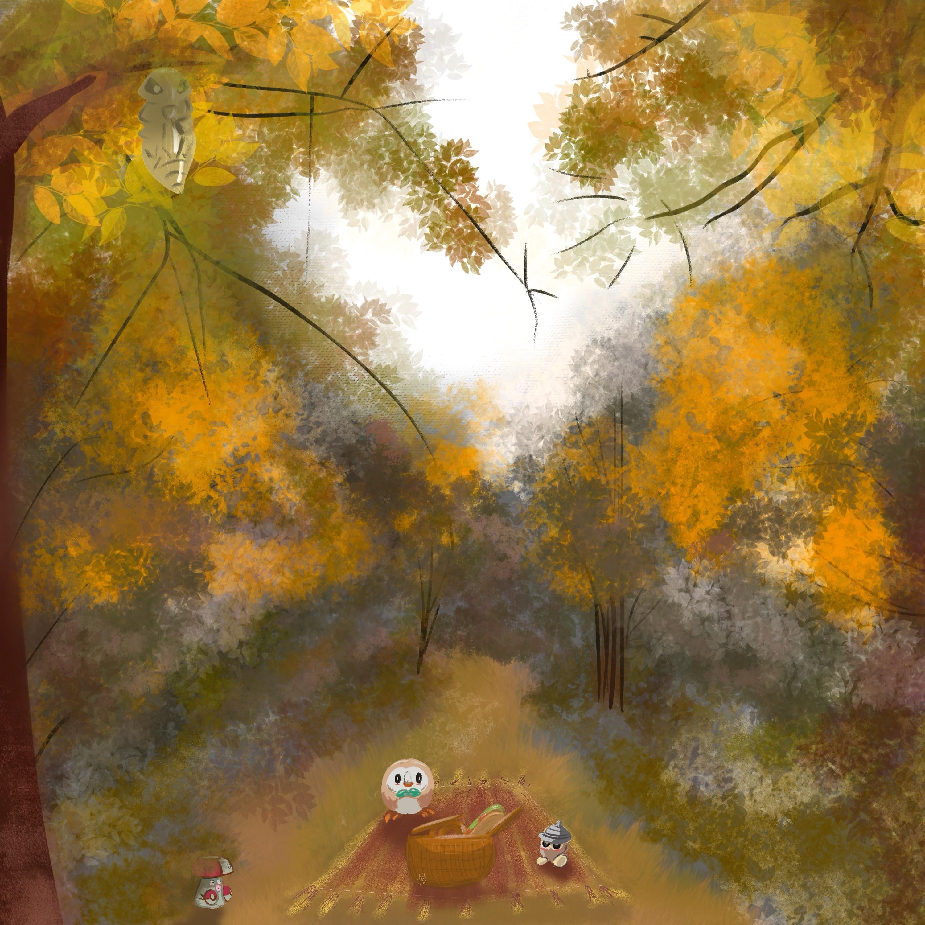 Hi all! I normally draw people/emotes for twitch styled things but have been playing scarlet recently and wanted to try my hand at a picnic scener. The forest is based off an irl image I took. I’ve never been very good at textures such as clothing or nature or materials, hence why I usually draw twitch emotes or cartoons. Let me know any tips you have for pokemon inspired scenery?