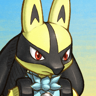These are digitally-handmade fanart portraits of Lucario Pokémon facing forward towards the right side of their images at a 3/4 angle with stoic facial expressions, on a blue-to-yellow gradient background.