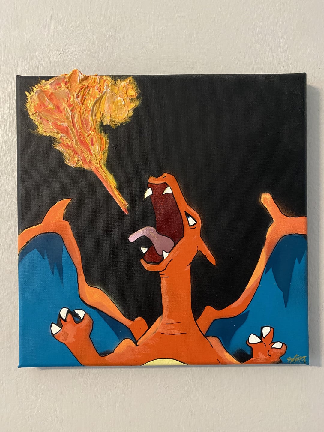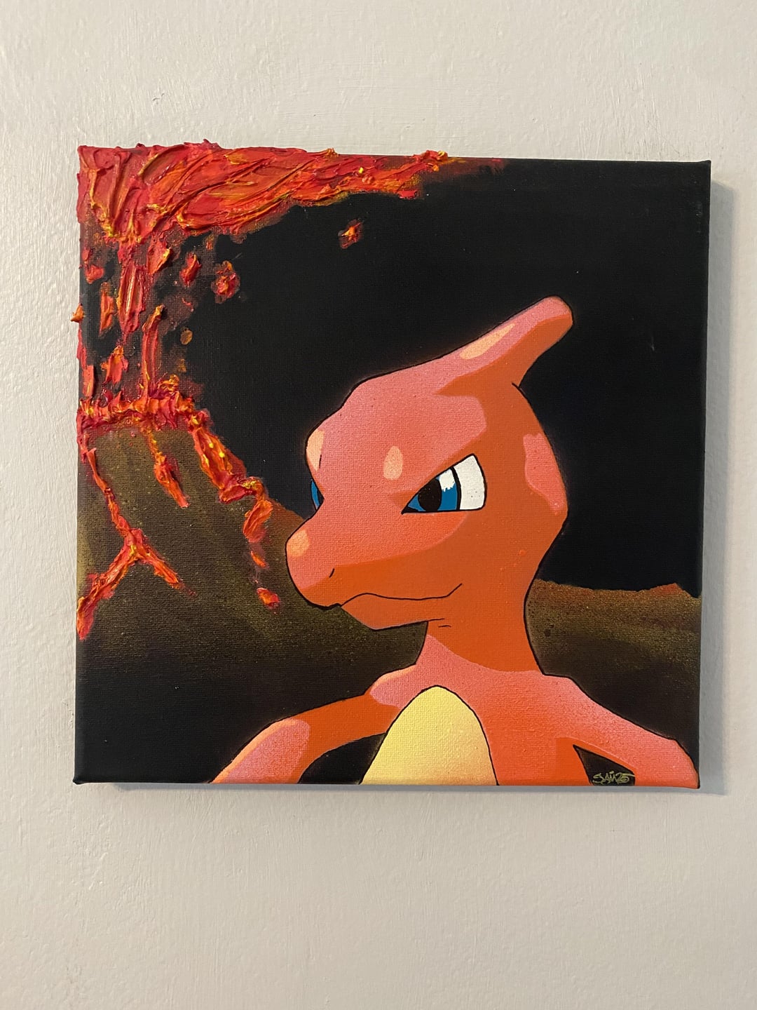 Textured Charmander evolution paintings made with spraypaint and acrylics
