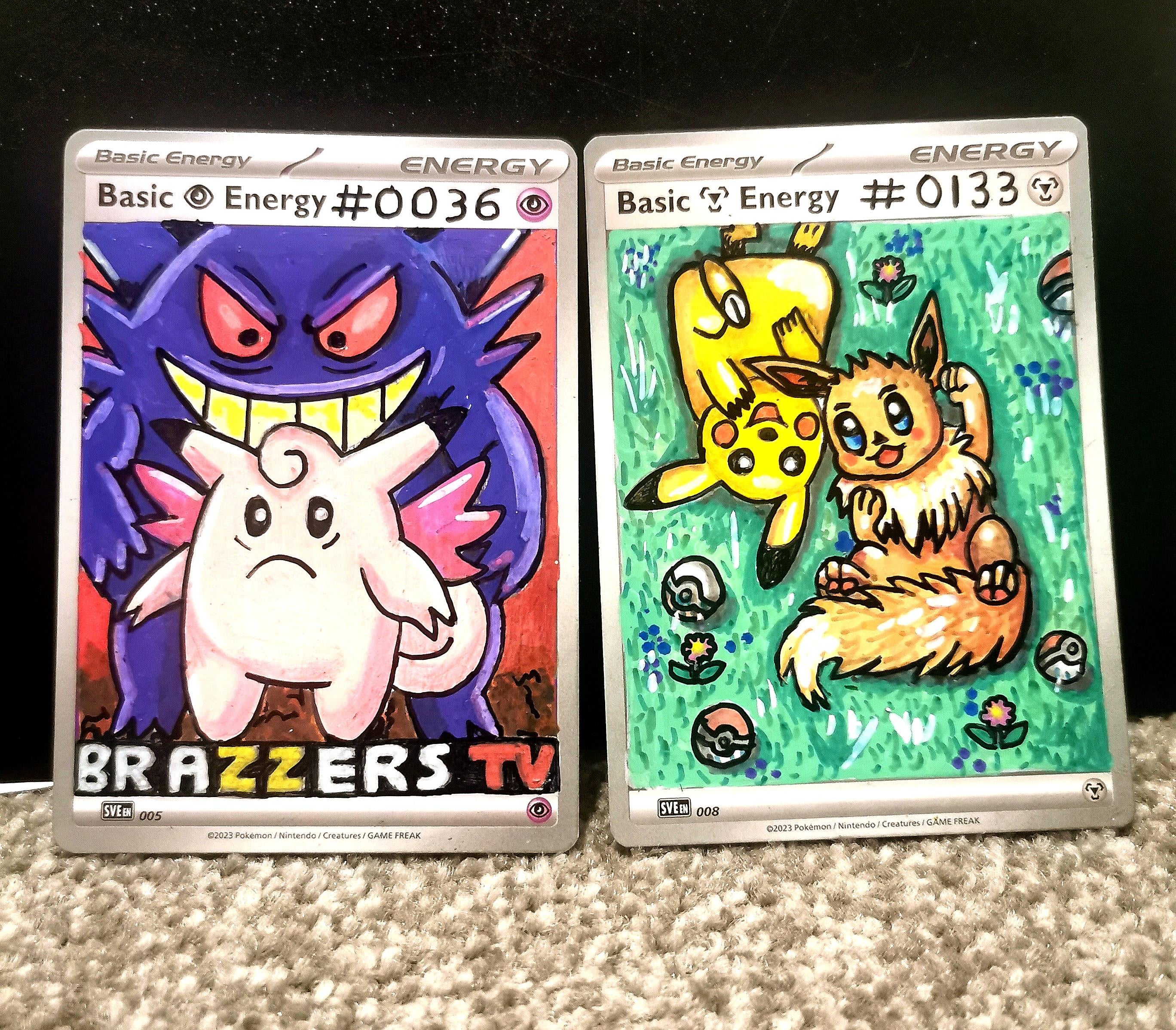#036 & #133 completed for my one5one picture pokedex on (energy cards) after peaple saying gengar was looking sus had to add a cheecky lable to this dark card 😂 (oc)