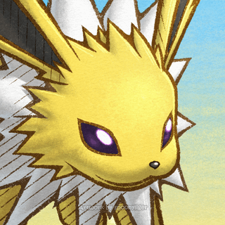 In the second image, Jolteon has a smiling facial expression, and is on an blue-to-yellow gradient background.