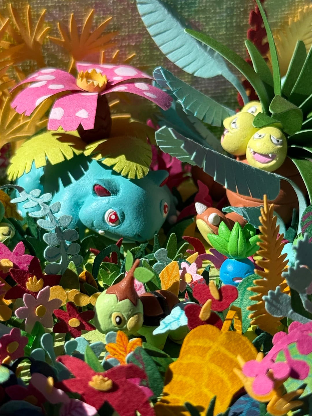 I was commissioned to make this diorama as a gift for a friend. All figures are made of polymer clay, flowers and ground are made of cardboard and paper. Art is based off the 151 Venusaur full art card, with a few of my friend’s favorite Pokémon added in. What would you like to see me make next?