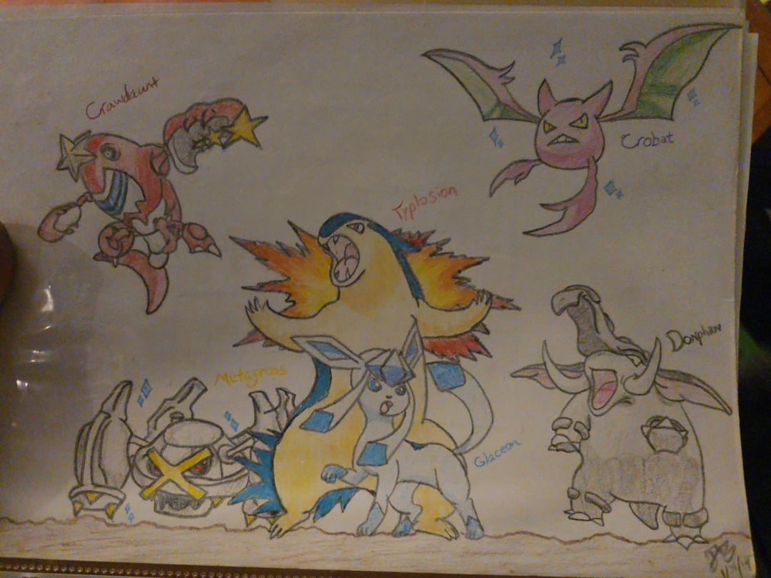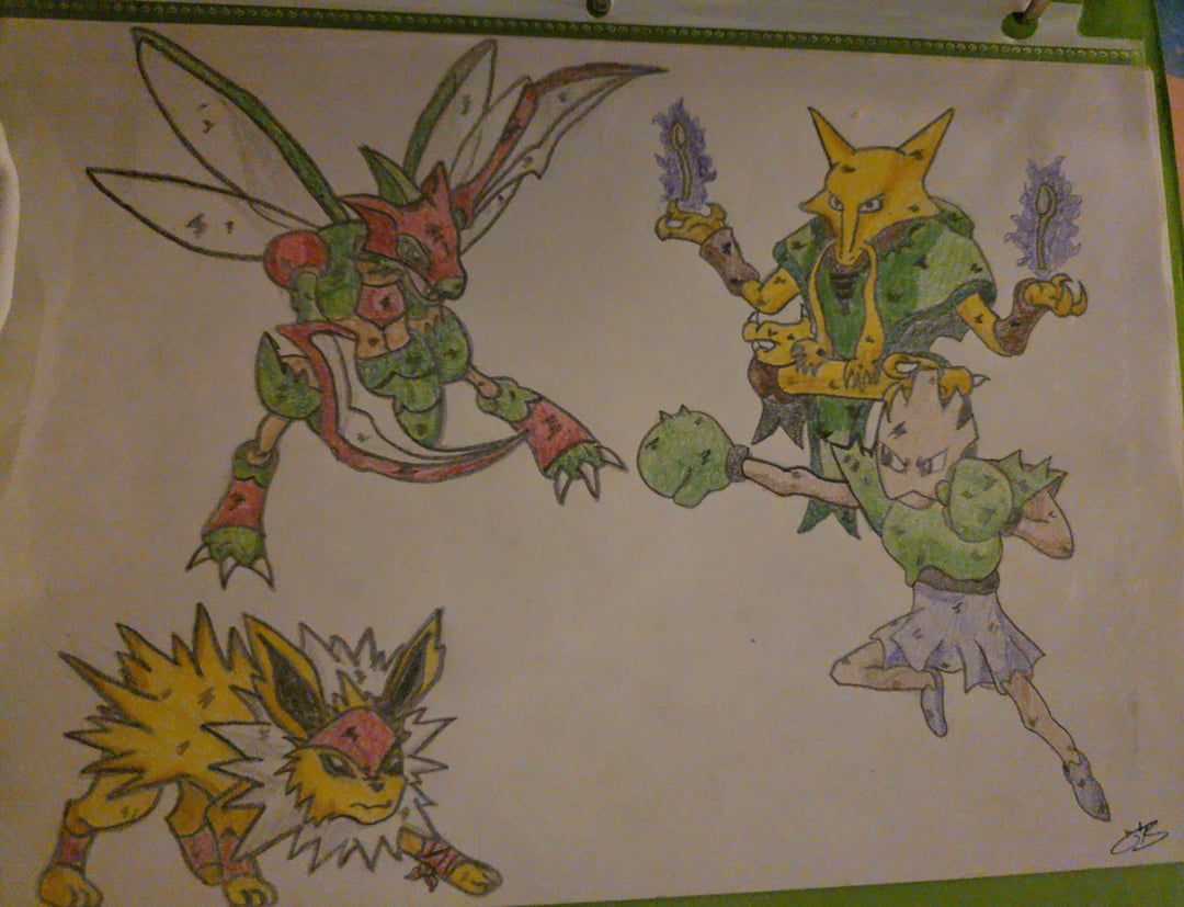 Found a binder today with some Pokémon drawings from 10ish years ago. A friend’s team, the great war, and some Gijinka. 🤙