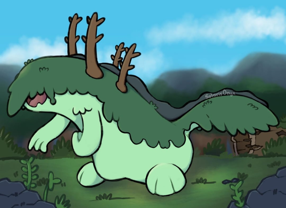 Towering and lazy, Mossire is a gentle giant who protects the forest. Smaller Pokémon nest in its mossy hide and lost humans are often guided to safety upon its broad, cushioned back.
