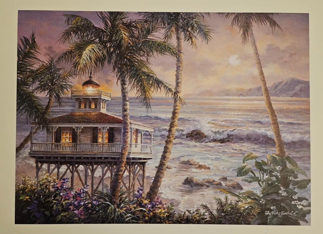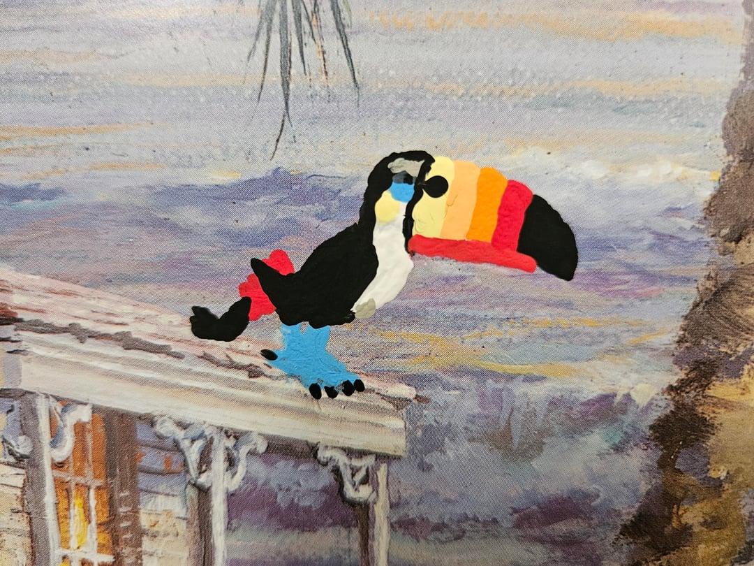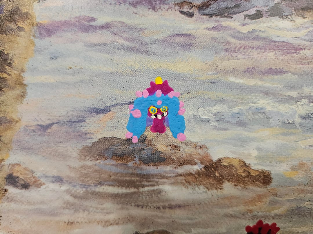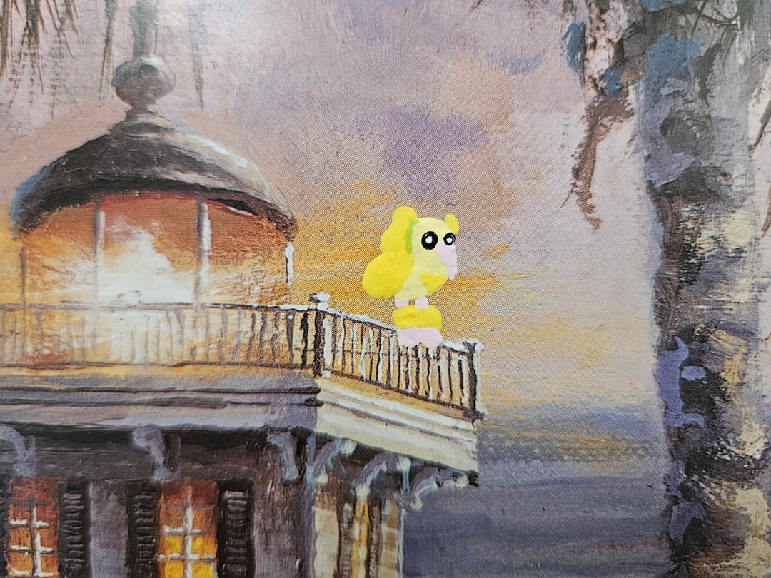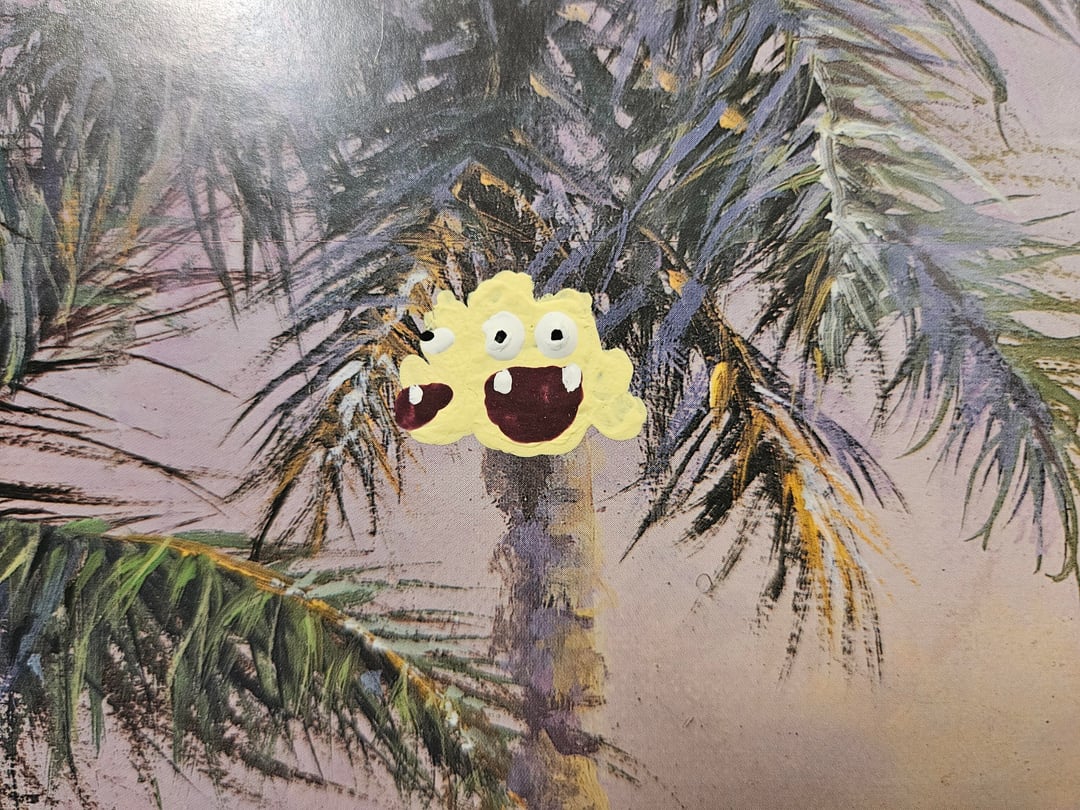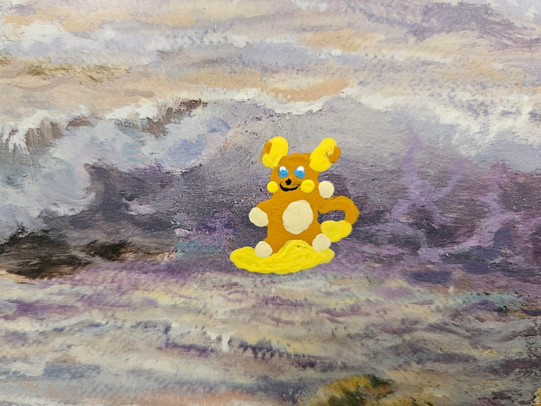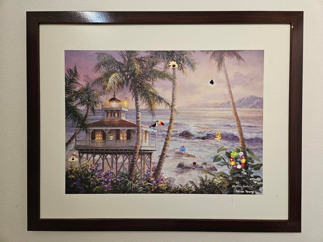 A bit ago I found this printout of a painting of a Hawaiian beach sunset that was at goodwill and thought it would look really cool with some Alolan Pokémon painted onto it, so I took it home and today I just finished what I was hoping to add to it. The Alola region is the Pokémon equivalent of Hawaii, so I added all Alola native Pokémon. Those being Mimikyu, Alolan Raichu, Sandygast, Wimpod, Cutiefly, Pyukumuku, Toucannon, Oricorio, Comfey, Mareanie, and I also made one of the palm trees into Alolan Exeggutor, and added the silhouette of Tapu Koko over the sun. I'm really happy with how the paint blended in well with the style of the painting so it looks natural, and I'm happy with how I was able to paint these Pokémon small enough while still looking good. The second picture is how it looked before I painted onto it, and I also included close ups of the Pokémon I added in order of how I listed them
