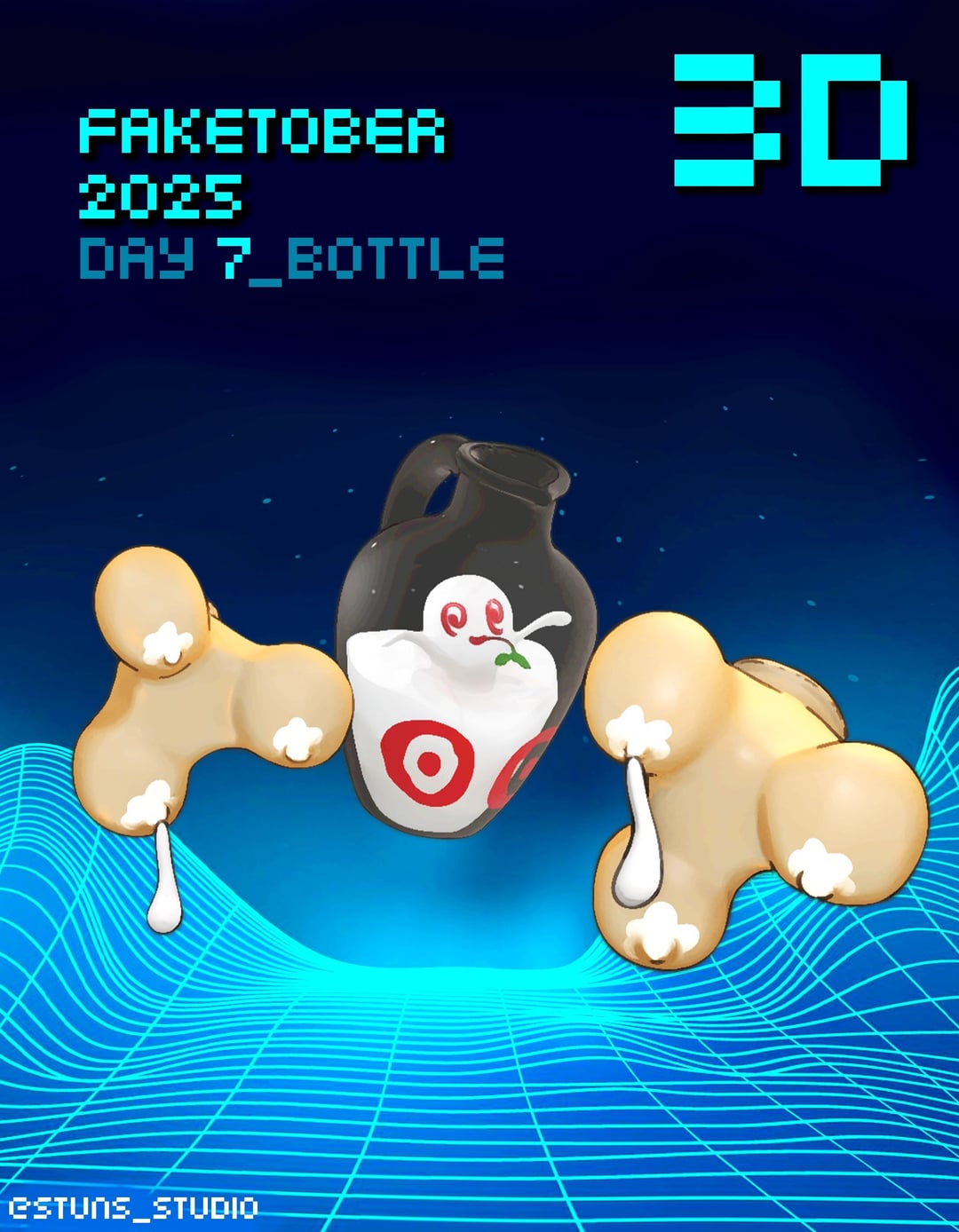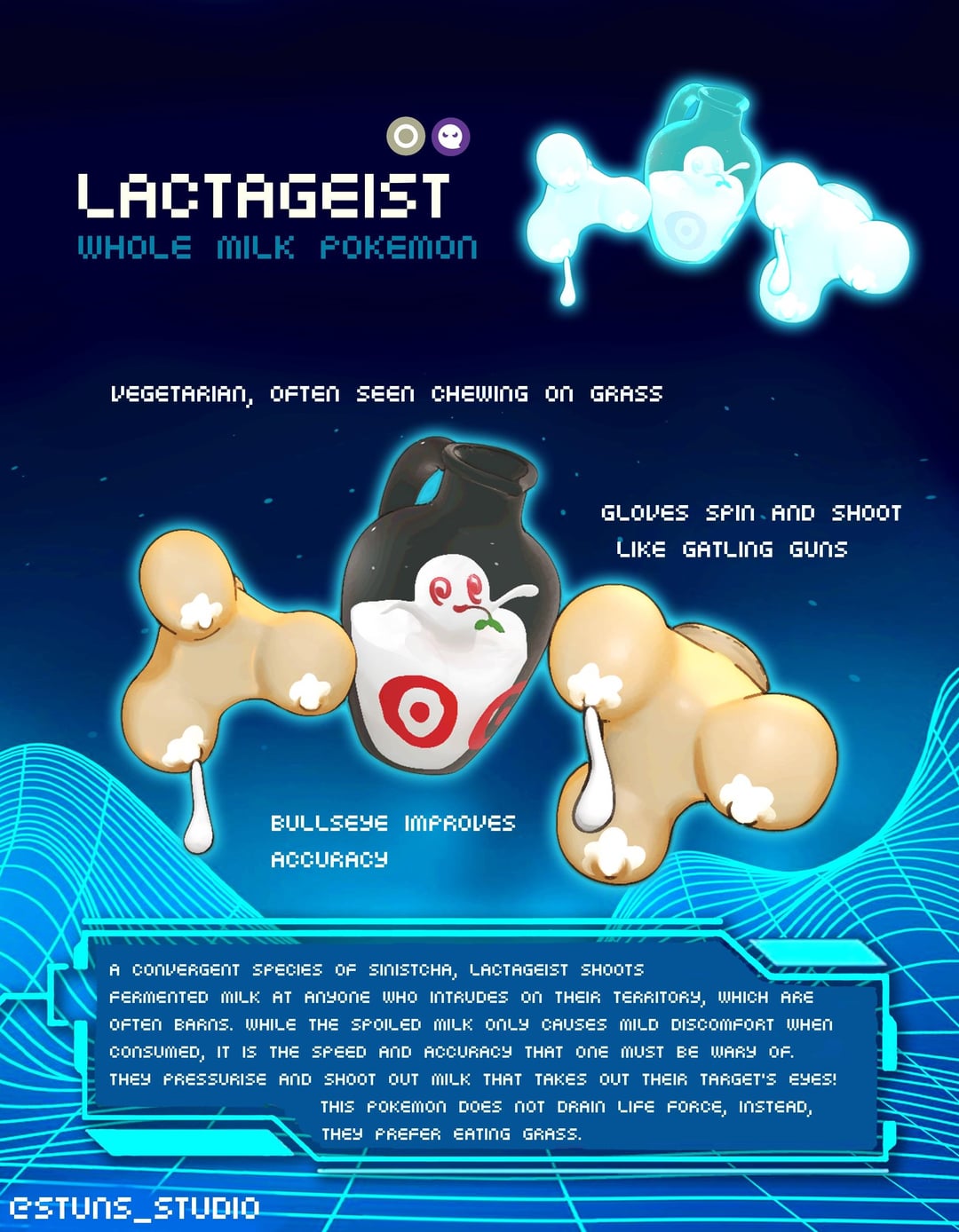 day 7 of faketober2025, a milky convergent species of Polteageist with the soul of a cowboy! it shoots milk out like gatling guns from its gloves and likes to chew grass. It actually makes its own milk despite living in barns, but since rarely anyone drinks it they become spoiled 🥛