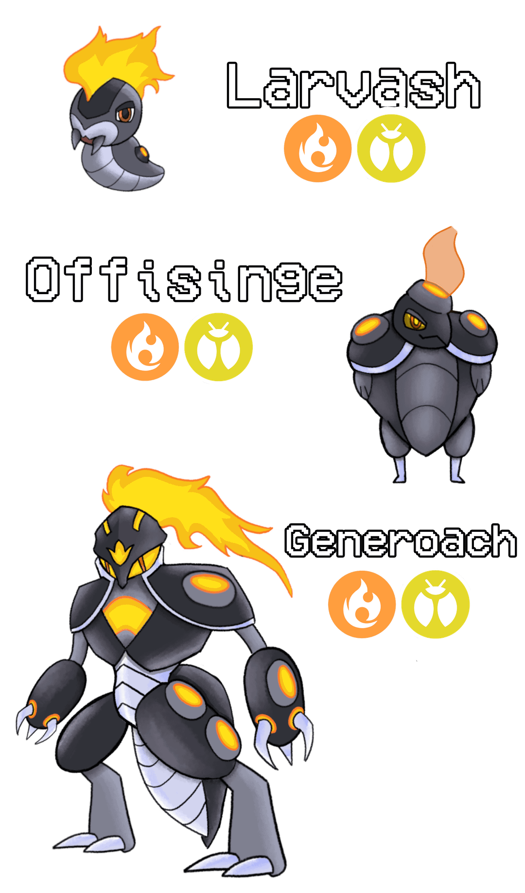 The Fire starter line! He's Larvash's complete evolution line, along with Dex Entries #004, #005, and #006!