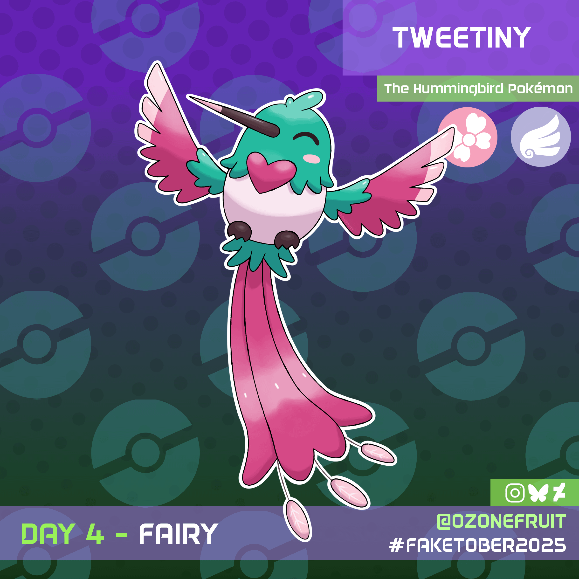 Tweetiny is one of the smallest Bird Pokemon ever discovered, easily being able to perch on your finger. They are also incredibly fast and agile, buzzing from flower to flower to drink nectar. Brighter, longer tail feathers indicate they are in good health!