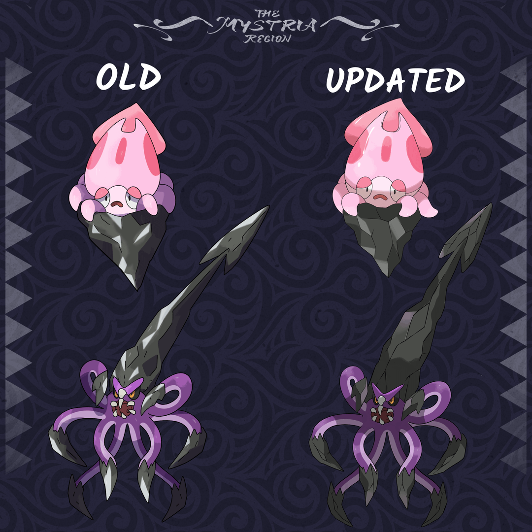 Just updating one of my first ever made fakemon lines (second line to be exact) with the art style of the current artist I work with. Saw nothing wrong with their poses either so it's literally just the art style that is different, but I'll also go ahead and explain both of these guys since they are some veterans of mine who not everyone has seen. Should also note that I see nothing wrong with the original art either, just wanted the art style to match every other fakemon I've had made so far