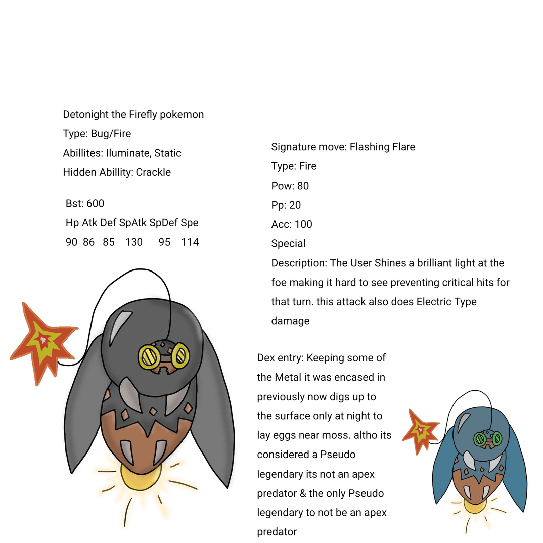 Honestly the was probably been the most time ive had to think of an idea for a pokemon. I wanted to make a Bug Pseudo legendary & what better option to do a firefly! To me their pretty rare to see now n days.