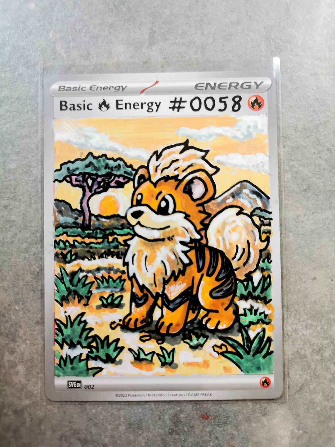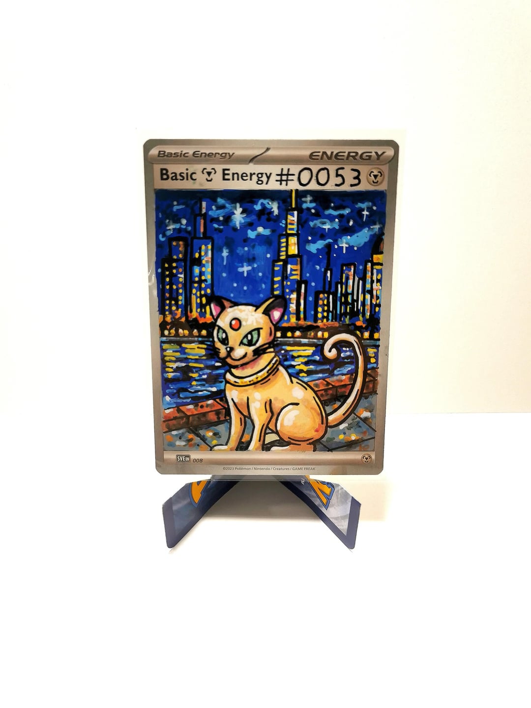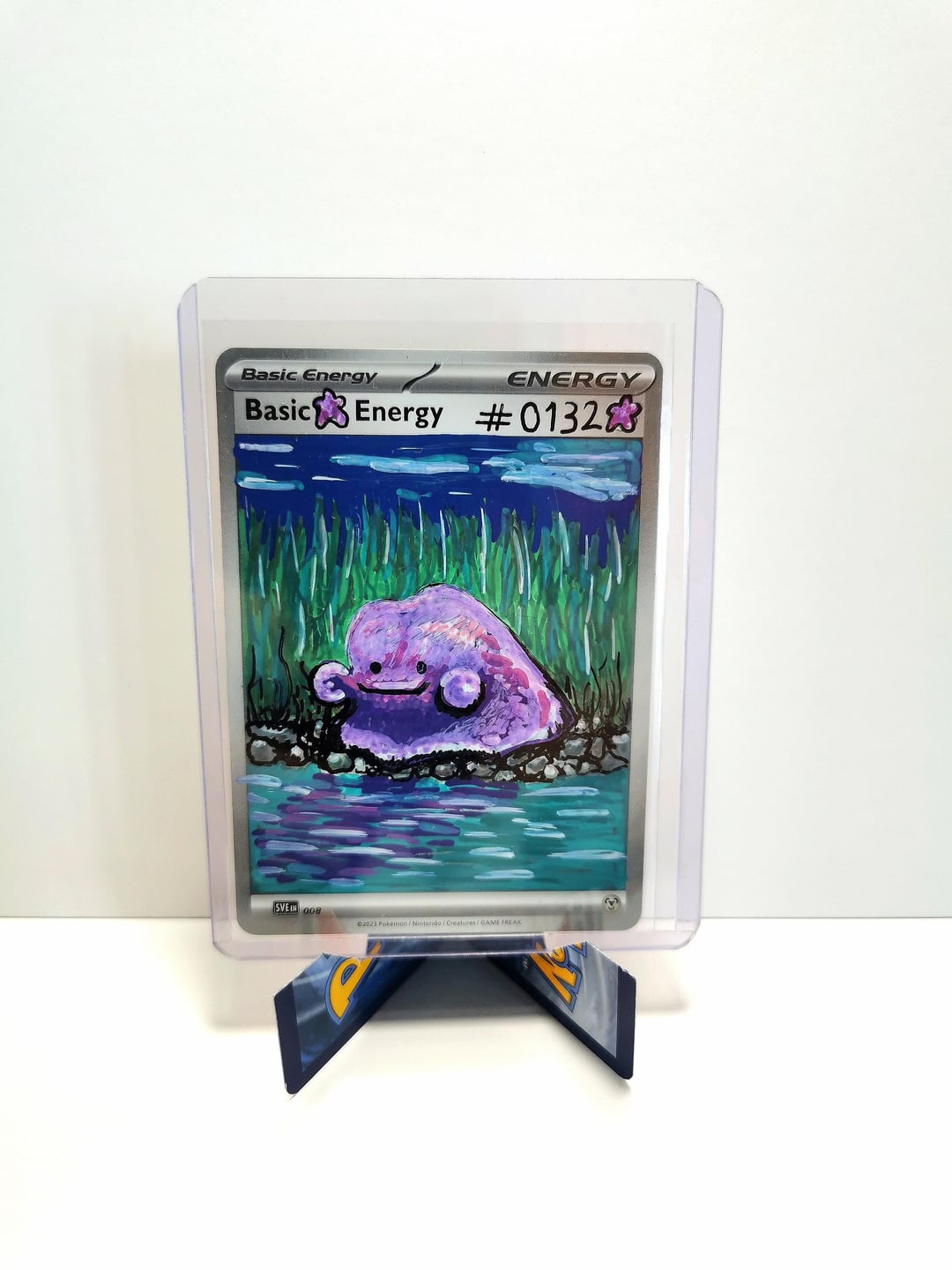 Each card is a one-off piece, drawn straight onto real energy cards, with full backgrounds to bring the scene to life.