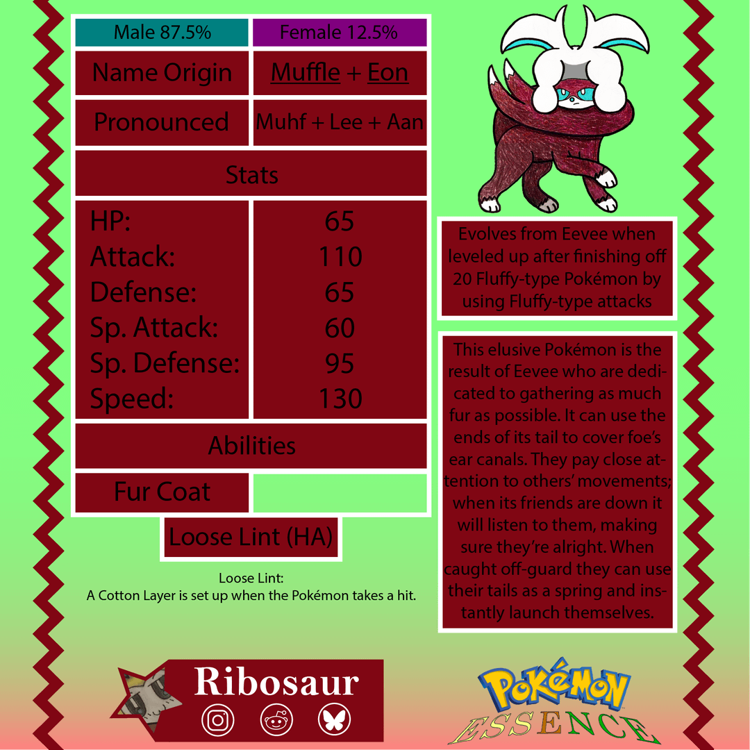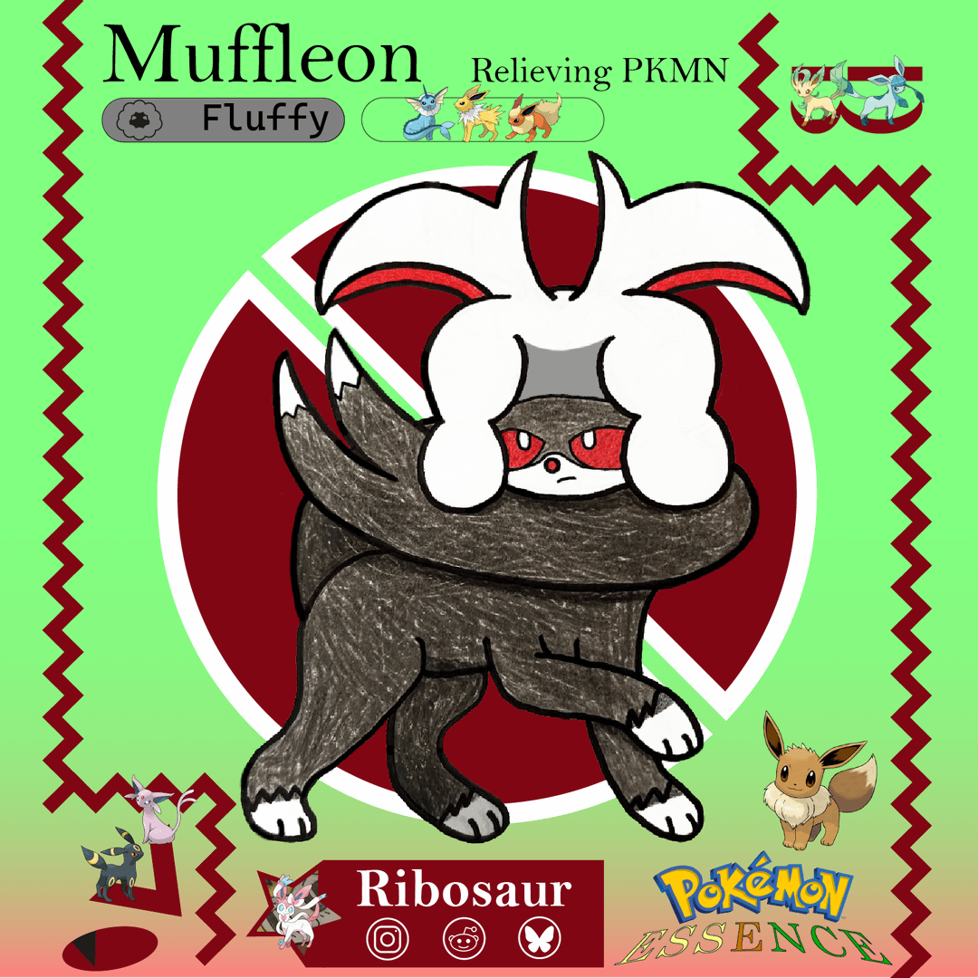 Hi there! This is an Eeveelution for my fakémon region based on Peru! It introduces a new type so I made Muffleon to go along with it like how Umbreon and Sylveon did when their types were created. I tried my best to make it fit with other Eeveelutions with the proportions and simplicity in main features, it was quite fun! (A bit tricky tho) Big fan of this guy.