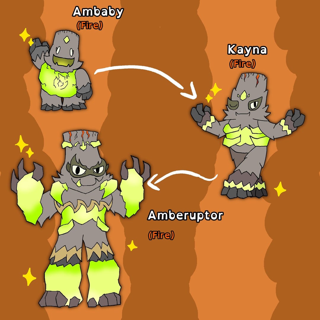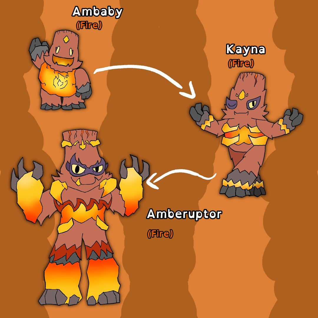 fire type of the “starter” trio. 2nd slide has shiny based on rare kayna and slide 3 has kayna + the other monsters part of the trio