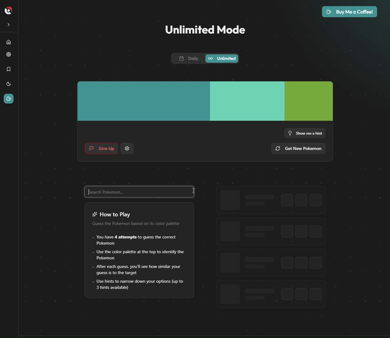 The game has 2 modes – Daily & Unlimited, it has both normal and shiny pokemon, includes all pokemon from Bulbasaur to Pecharunt, has hints, and you can filter by generation on the unlimited mode!