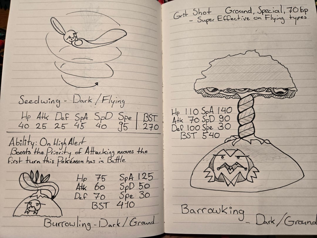 Burrowling: It fiercely protects the sapling that grew from the seed it chose, using it's tail to deflect incoming attacks. It's nervous and distrustful disposion means it never leaves it's burrow, and is always on the lookout.