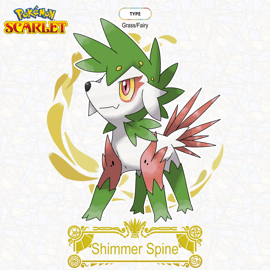 Deep within a Paldean forest there have been sightings of Shimmer Spine, a creature similar in appearance to a Shaymin after dawning a Gracidea flower. It is named after a spine wielding creature of matching description that is mentioned in the Scarlet Book. Its aggressive disposition and wild appearance has sparked rumours of this beast being a look into what would happen if Shaymin were to be adopted into a family of dinosaurs.