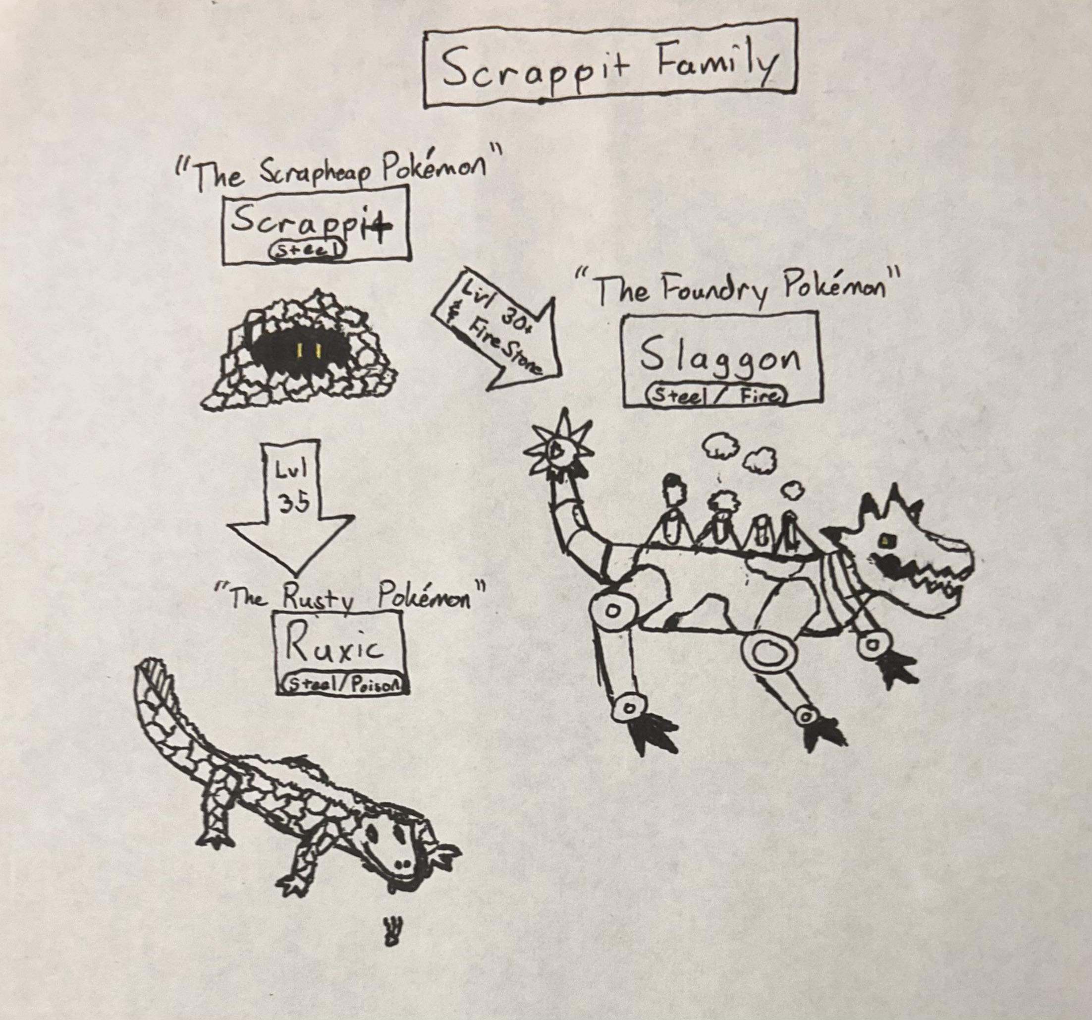Scrappit– This Pokémon lives in junkyards, collecting scraps of metal that it uses to build a nest. It eats the corrosion off of the pieces of scrap, requiring it to continue to hunt down more pieces of metal.