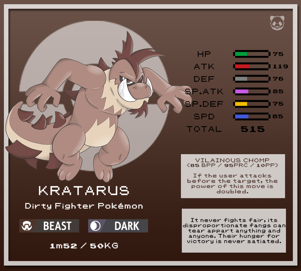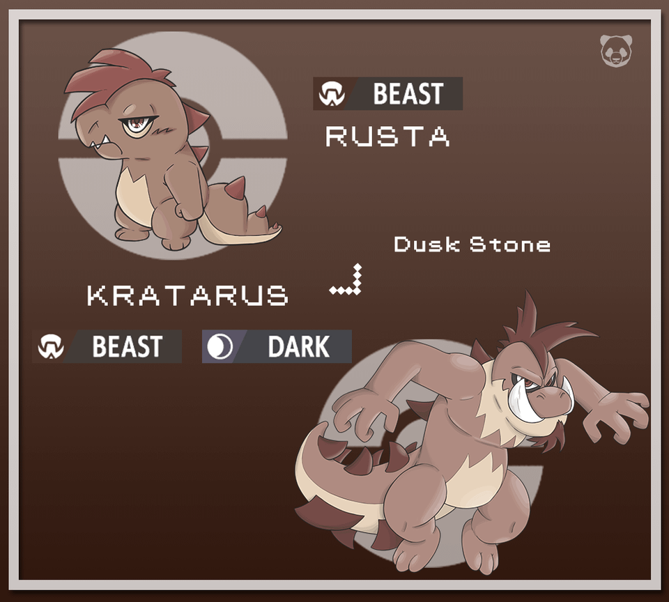 It ressembles Totodile's long lost cousin, maybe it's a savage version of it, one that didn't evolved for centuries… Rusta's name comes from the french word "Rustre" which is a brutal, ill-manered individual as well as being a shorter, rearranged version of Kratarus' name.