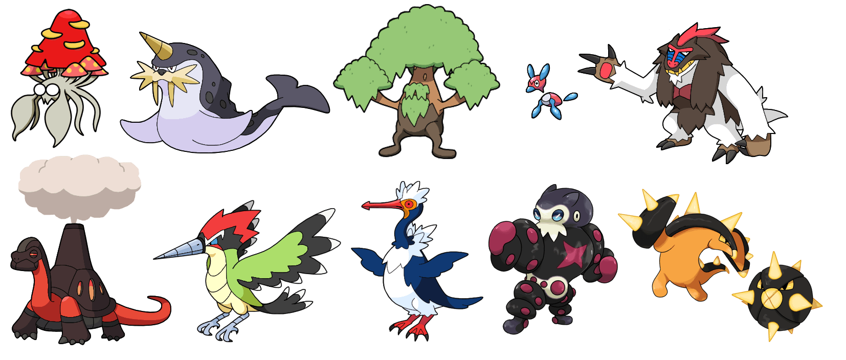 Bottom row: Torkomine (Fire – Evolves from Torkoal with Lump of Coal), Whirlpek (Flying/Steel – Evolves from regional Trumbeak at level 28), Plunguin (Flying/Water – Evolves from Cramorant after learning Ancient Power), Skulkraken (Fighting/Dark – Evolves from Grapploct after learning Foul Play), Urchpain (Electric – Evolves from Pincurchin after learning Spiky Shield)