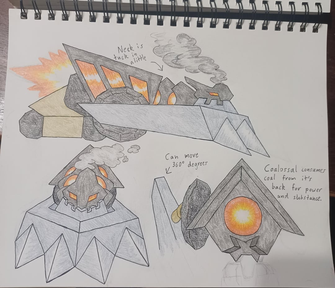 These will be my entries for Subjectively's "Worst Pokemon Contest". Honestly , I really like origin Coalossal as it reminds me of Golem , who's probably my favorite rock type. Idk , a little dinosaur looking dude with a small boulder body is dope/cute to me1😅. I don't really like Carkoal though. For some reason it losses the glowing eyes , replaces wheels for legs even though it's a mining cart , and just plain derpy looking ( and not in a charming way). I wanted to expand on the train elements and flesh out the kaiju elements aswell. The idea that I had for the final design read as a Pseudo Legendary , and I high key kind of loved it. Pokemon could use more non dragon Pseudos , so my Coalossal would be the second Pseudo for Galar. Here are it's stats and hope you enjoy.