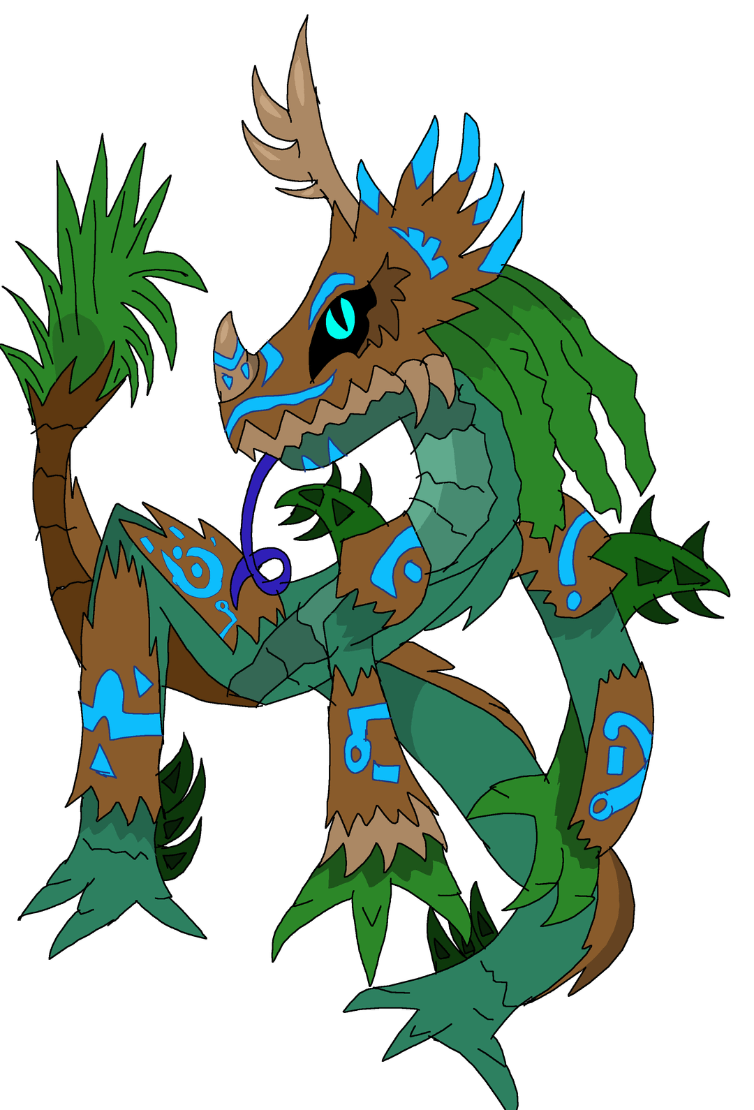 "It has a strange aversion of touching the ground thus this Pokemon lives exclusively up in the Sacred Forest's canopy. The markings on its wooden armor glow with Psychic energy that tends to slightly distort the space around them."