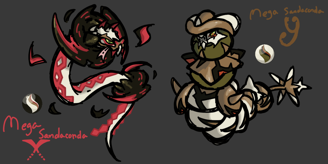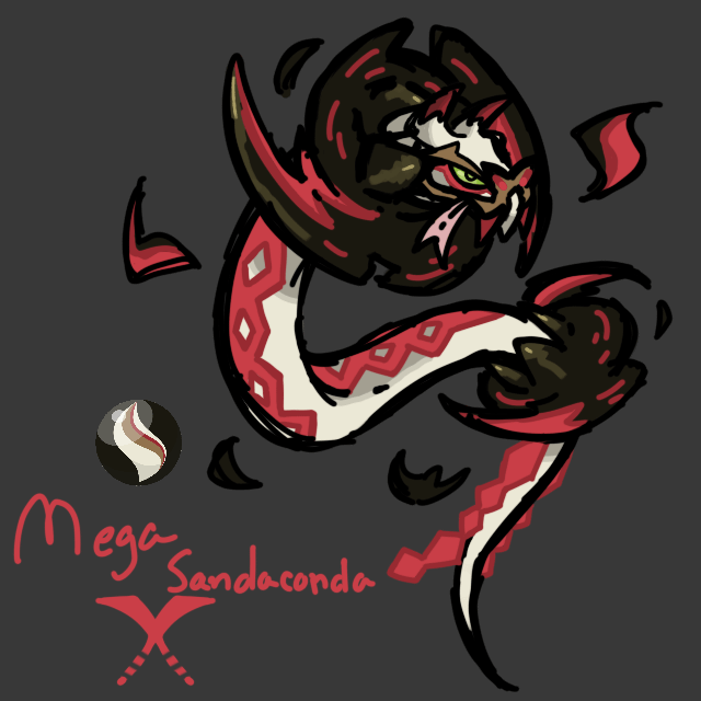 Mega Sandaconda X is based on Gmax Sandaconda and dust devils, with the patterns on Sandaconda’s head becoming horns.