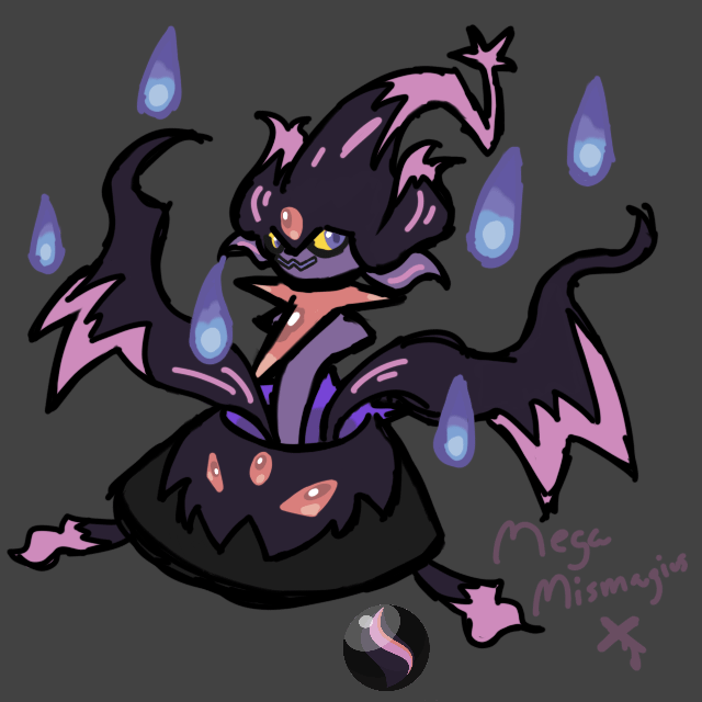 Mega Mismagius X is based on more cartoony witches and their pots, being in the pot itself this time. The flames around it are like potions in a sense. It’s Ghost/Poison.