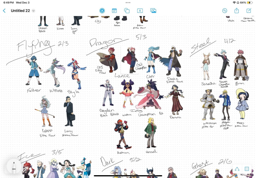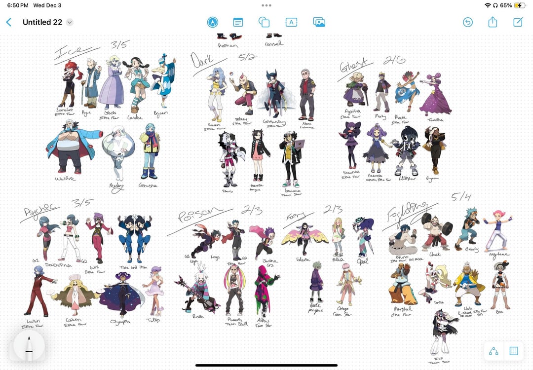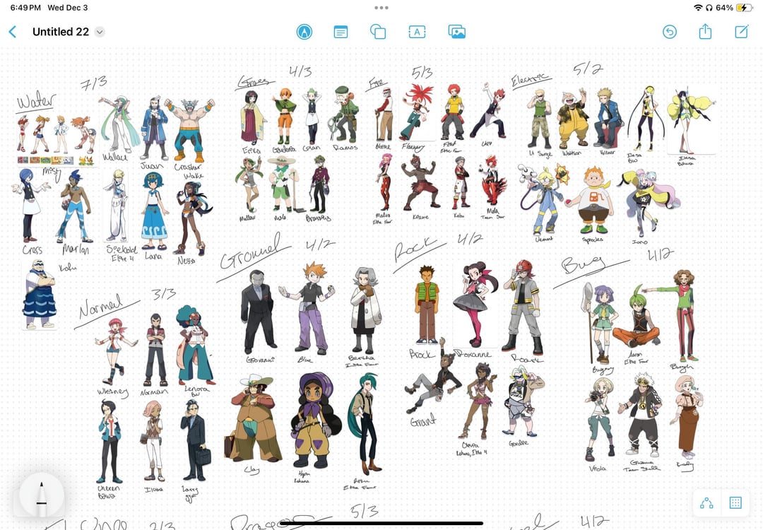 I’m into fashion design and compiled most of the characters (I didn’t include most of the antagonist teams for this since some aren’t type-specific, but I might do them all together and separate at a later time), but not all of their re-designs, and grouped them by type to see the similarities and differences, and the goal in this was to create the ultimate X-type trainer look based from a combination of the styling of these characters