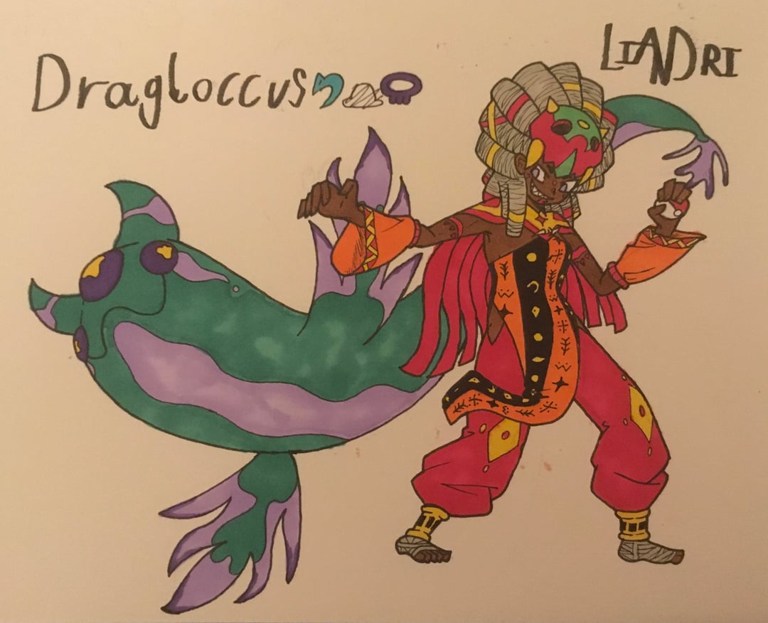 Liandri (from Dernis) is a Dragon type specialist who acts as a guardian of one of the ancient legendary temples during the Grand Battle — a festival/competition that takes place every decade where chosen members of each tribe scour the land in search of gilded trophies. Whoever has the most by the end of the festival is granted a boon from the legendary Pokémon.