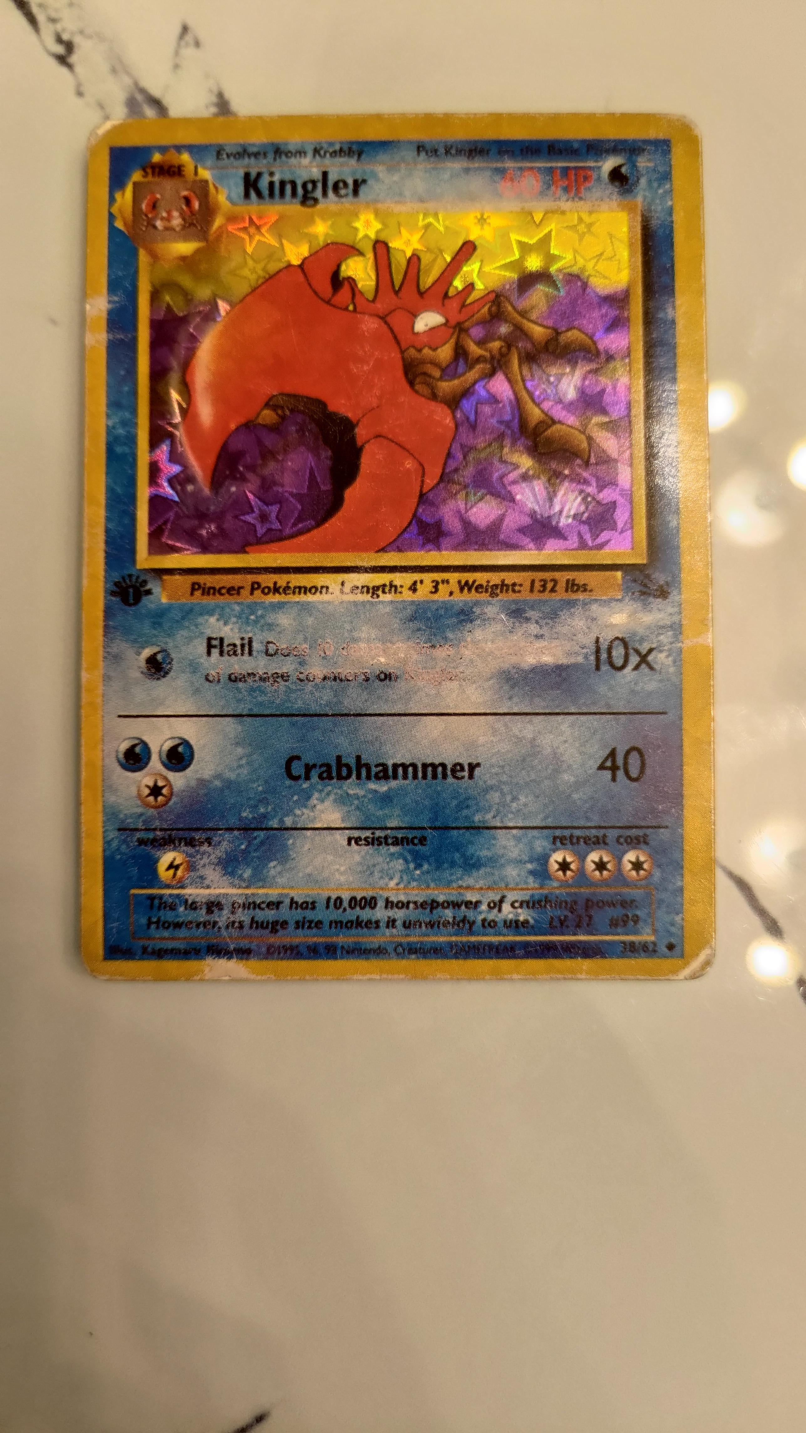 Hi all, I was going through my old pokemon cards and found this one. I can't find aby info on kingler holo cards. I'm not gonna lie. Its a bit sketchy, mych darker print than any other 1999 card i have. Is it fake? by PollutionNo2399 Write A CommentYou must be logged in to post a comment.