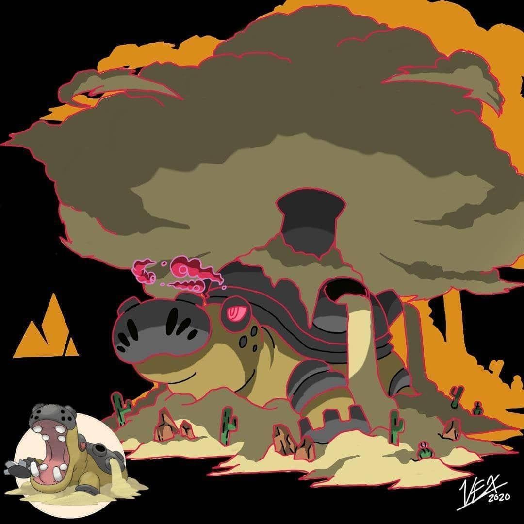 - Hippowdon: based on old Dunkleosteus designs, steam engines, and ancient temples(art by SoulSilverArt). Gmax move: Gmax sediment stream.