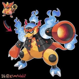 - Magmortar: based on an oni, Deinocheirus, primitive dinosaur depictions, and a factory(art by krimsonwho). Gmax move: Gmax expulsion.