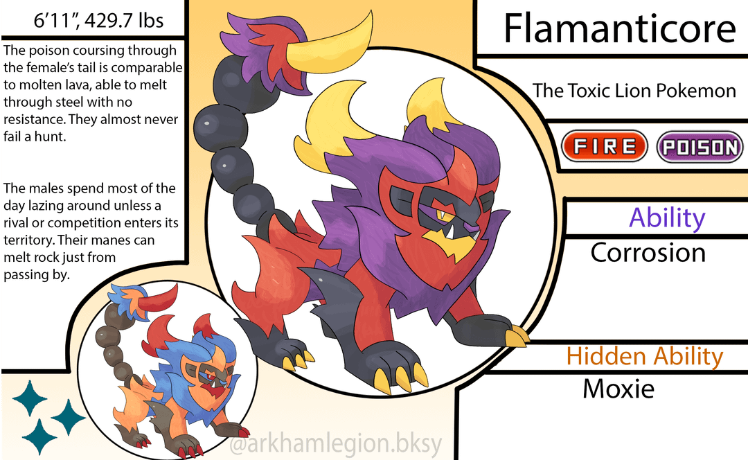 - The evolved form of Pyroar once it reaches lvl 45 w/holding a Toxic Orb. Based on Manticores
