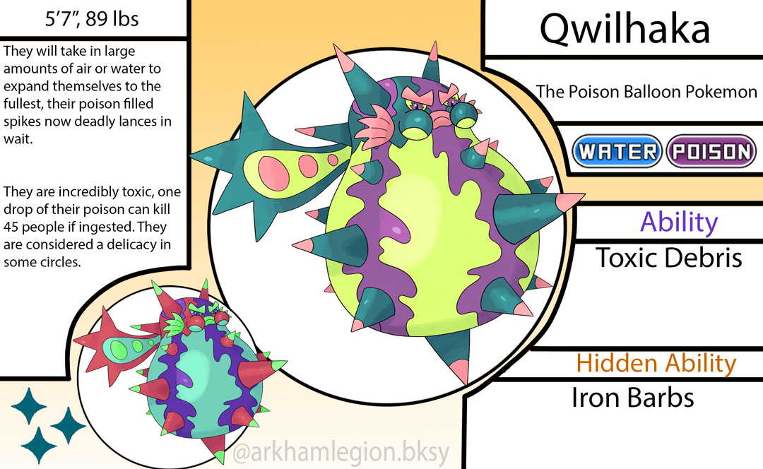 - The evolved form of Qwilfish when exposed to a Sludge Stone, based on the Fahaka Pufferfish.