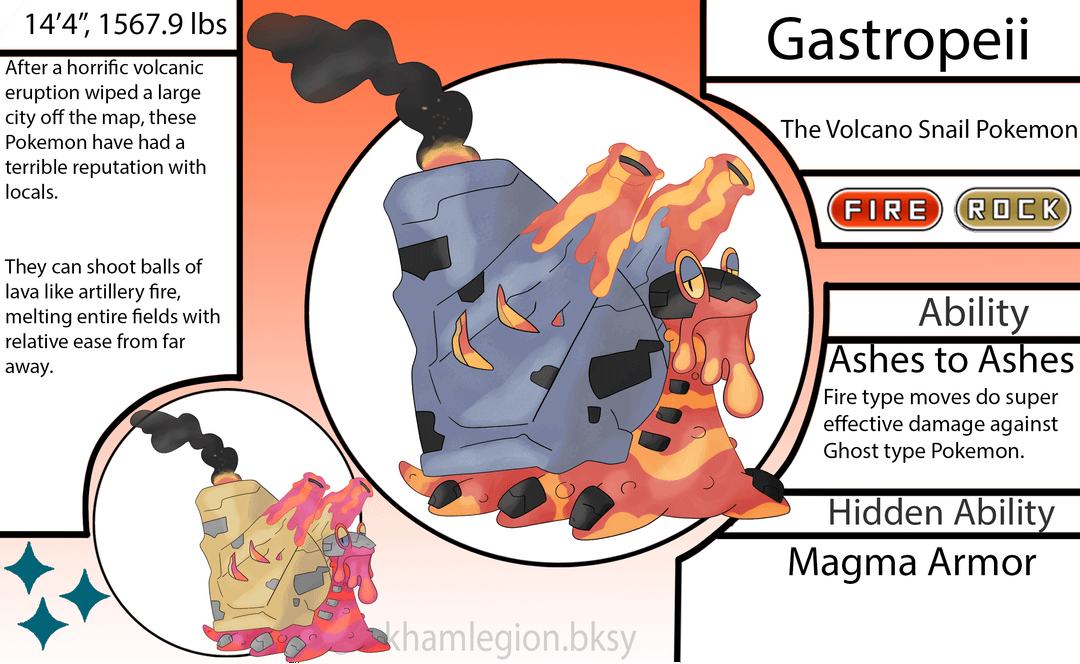 - The evolved form of Magcargo when traded holding a "Bag of Ashes". Based on Mt. Vesuvius and Pompeii.
