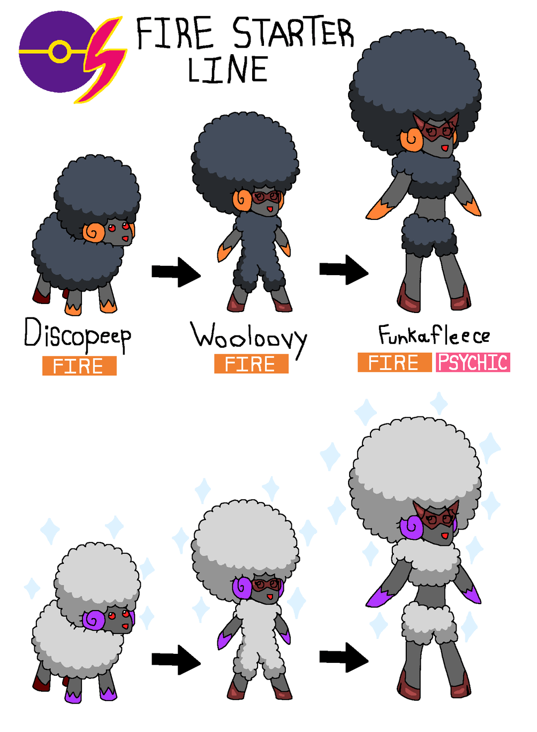 - – Discopeep, the Ash Sheep Pokemon (Type: Fire). The wool of these pokemon are not only very comfy, but are also self heating too! Blankets made from them are very popular in colder areas of Drasosia.