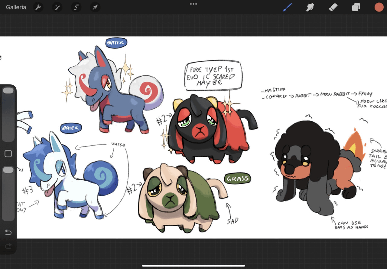 This is already a long post so imma just write the general idea for the Pokémon: a Tibetan mastiff which is a protector and has many spiritual connections, the moon(which is one reason as to why the fur collar is like that, later I was planning for the smoke to move around and reveal the moon) AND also the rabbit bc of the "moon rabbit" thing and that rabbits are seen as cowardly; if you need any more info/clarification I can write more in the comments, just ask away and imma do my best to answer in a way that makes sense-