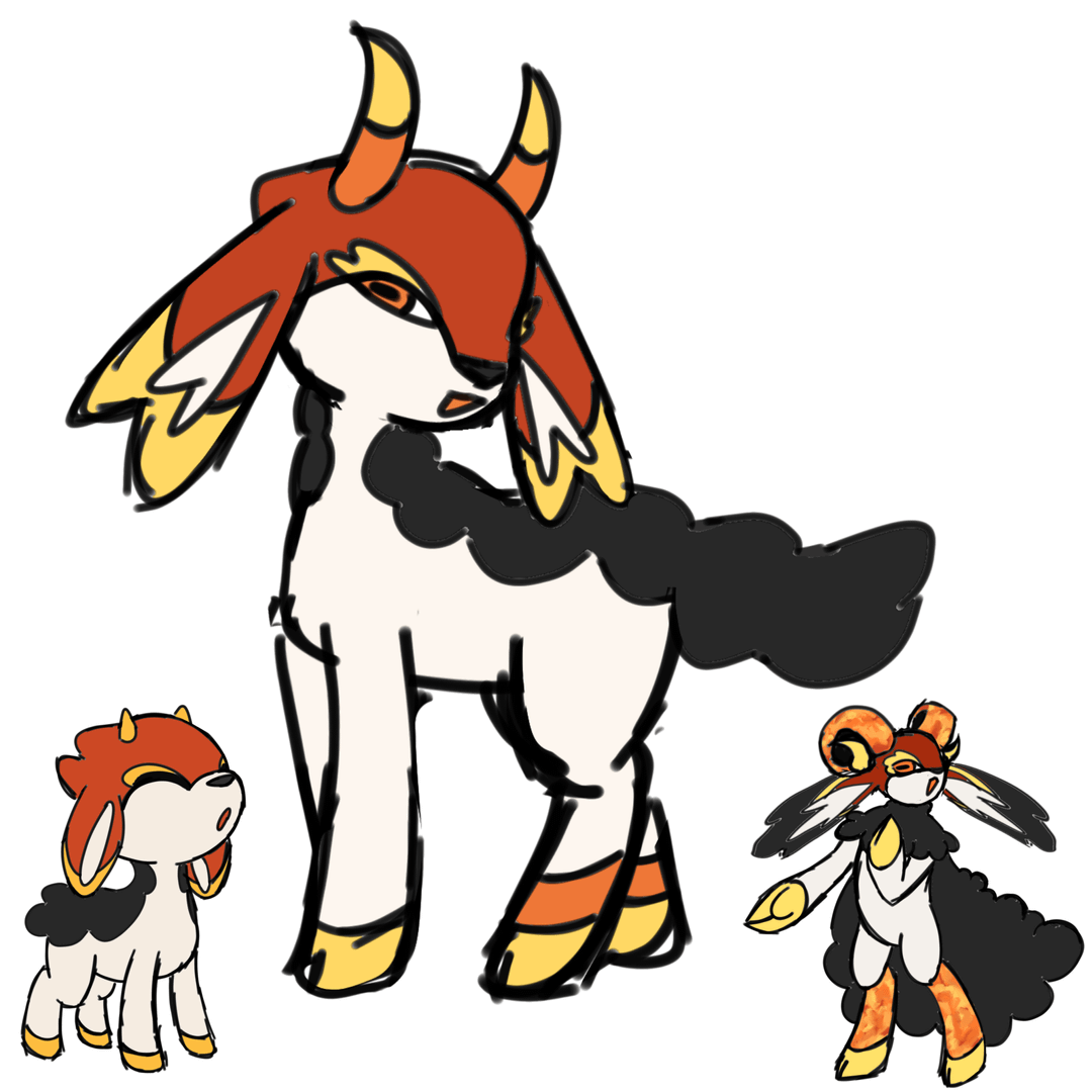 fire starter for me and my siblings region based on iceland! dont know what to call the first or second evo, but the basic mon is flaambe (like flambe but pronounced with lamb instead of lam). its a fire/poison (or fire/psychic havent decided yet). final evo is based is a poet