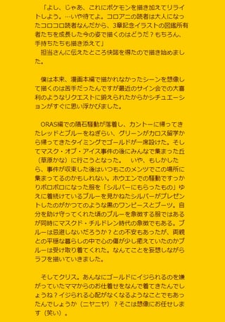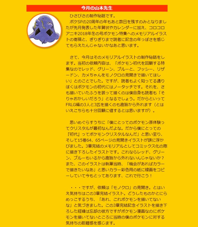 It's been a while since I shared a behind-the-scenes story. With only a few days left in the 20th anniversary year of Pokémon Adventures, I think readers got to feel the commemorative spirit right up until the end, thanks to the New Year's cards and calendar I announced last month, plus my contribution of a memorial illustration to the Pokémon feature in the Winter 2018 issue of CoroCoro Aniki.